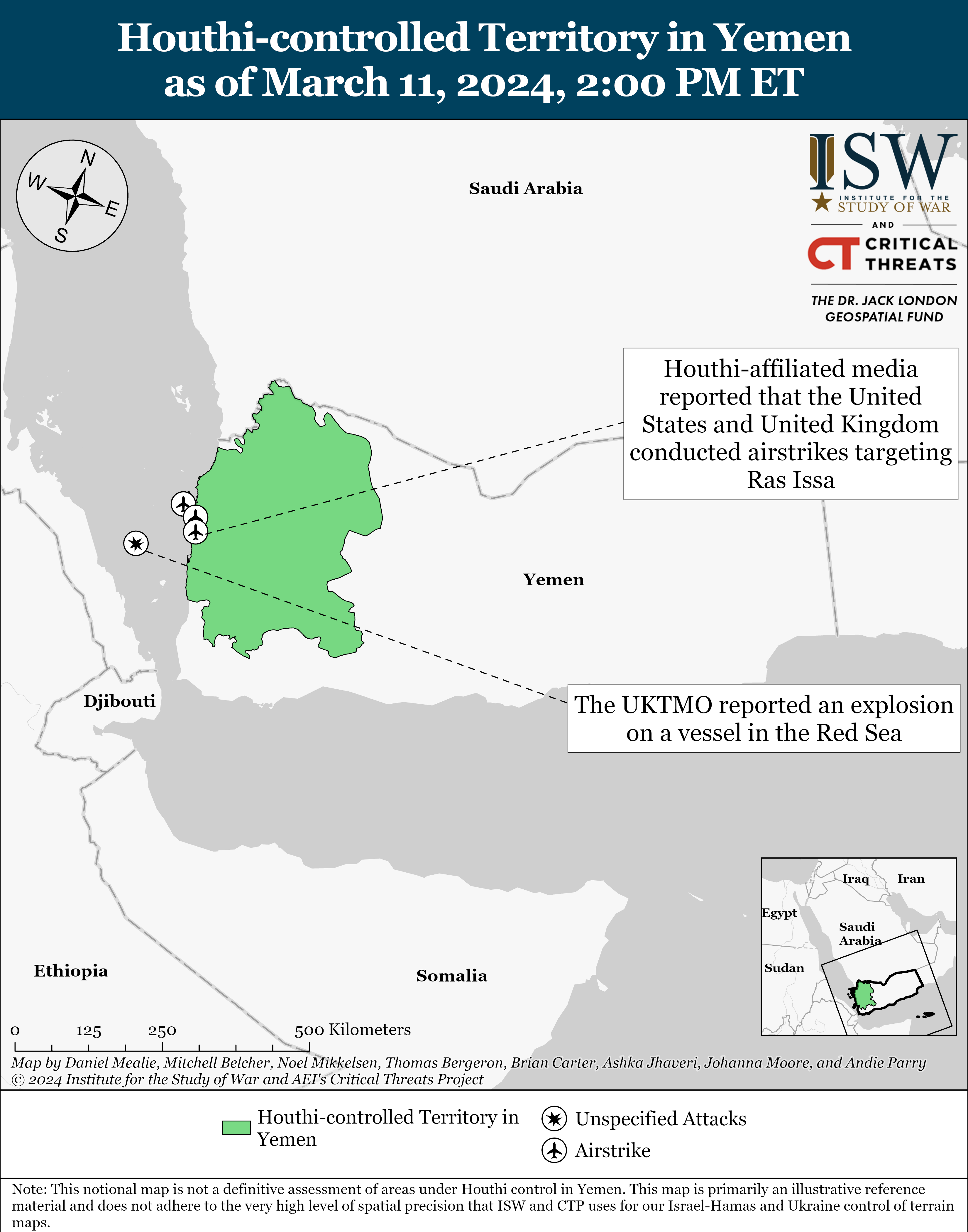 Houthi-affiliated media reported that the United States and United Kingdom conducted airstrikes targeting three locations in Yemen on March 11.[42] The strikes reportedly occurred around Ras Issa, al Urj, and Jabanah in Hudaydah Governorate. Neither the United States nor the United Kingdom have confirmed the strikes as the time of this writing.