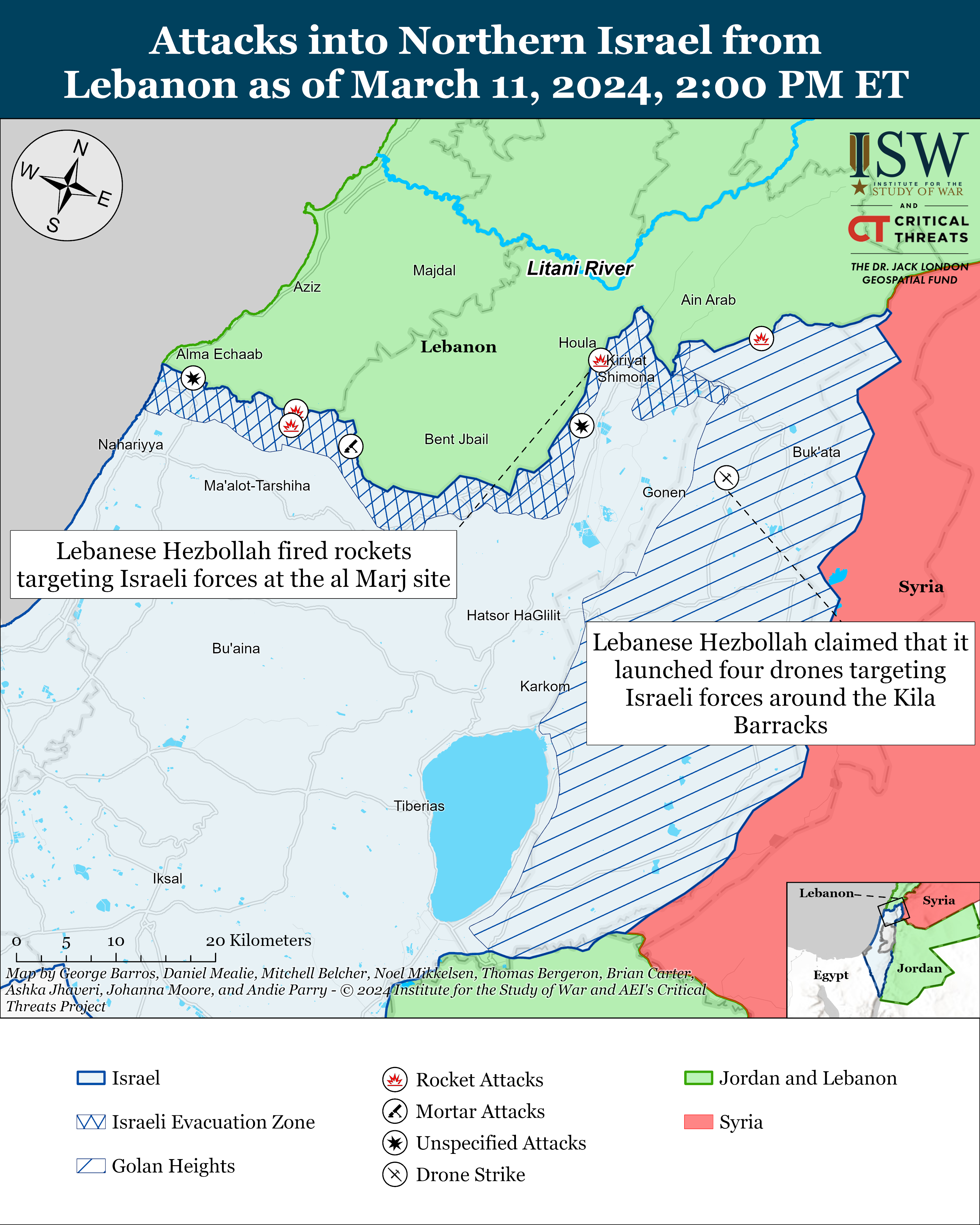 Lebanese Hezbollah has conducted at least eight attacks from southern Lebanon into northern Israel since CTP-ISW’s last data cutoff on March 10.[32] Hezbollah claimed that it launched four drones targeting Israeli forces at the Kila barracks in the Golan Heights.[33] The IDF said that it detected two drone, which landed in open areas.[34]