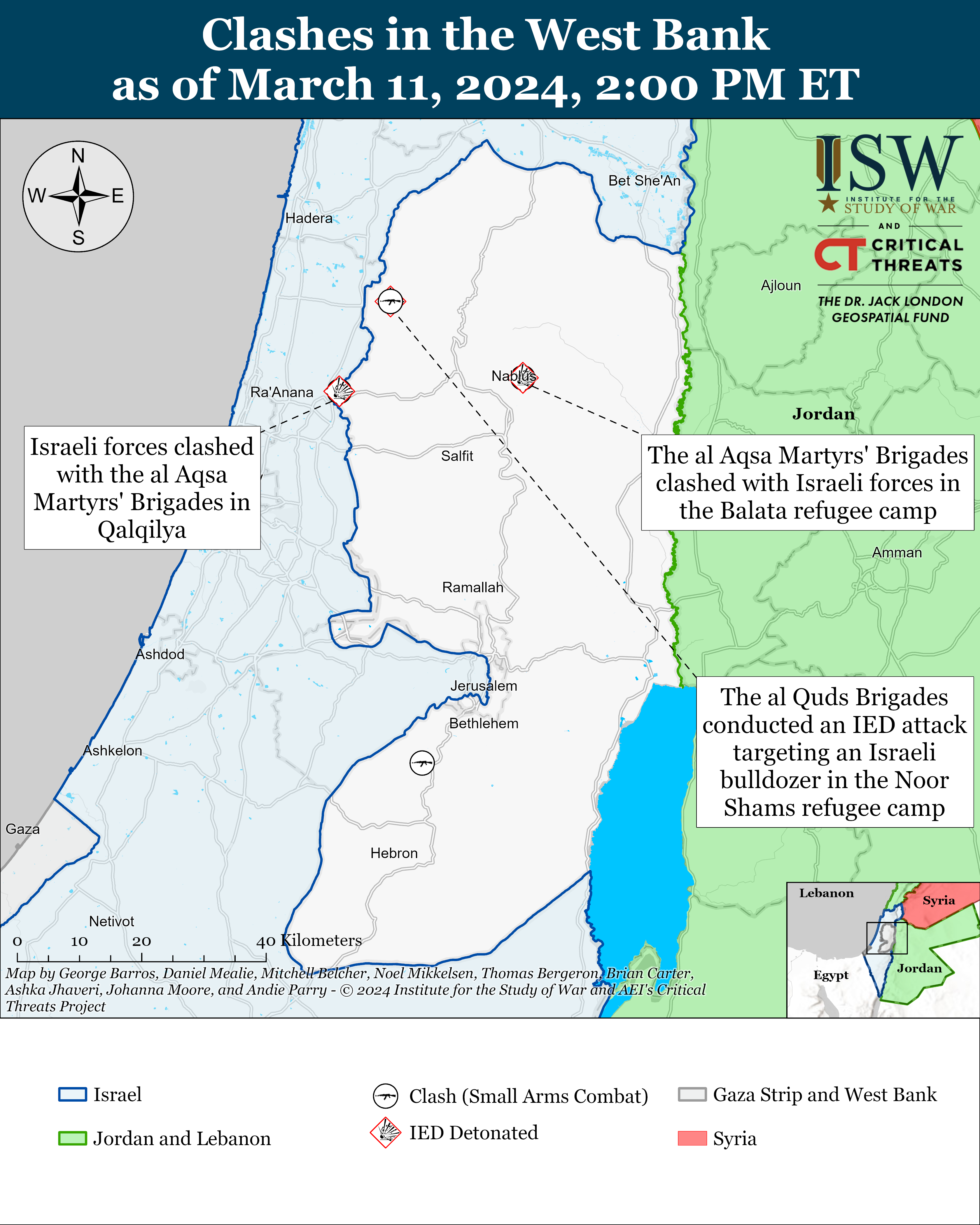 Israeli forces have clashed with Palestinian fighters at least eight times in the West Bank since CTP-ISW’s last data cutoff on March 10.[28] The al Aqsa Martyrs’ Brigades claimed that it detonated IEDs and fired small arms targeting Israeli forces in Tulkarm and Nablus on March 10.[29]