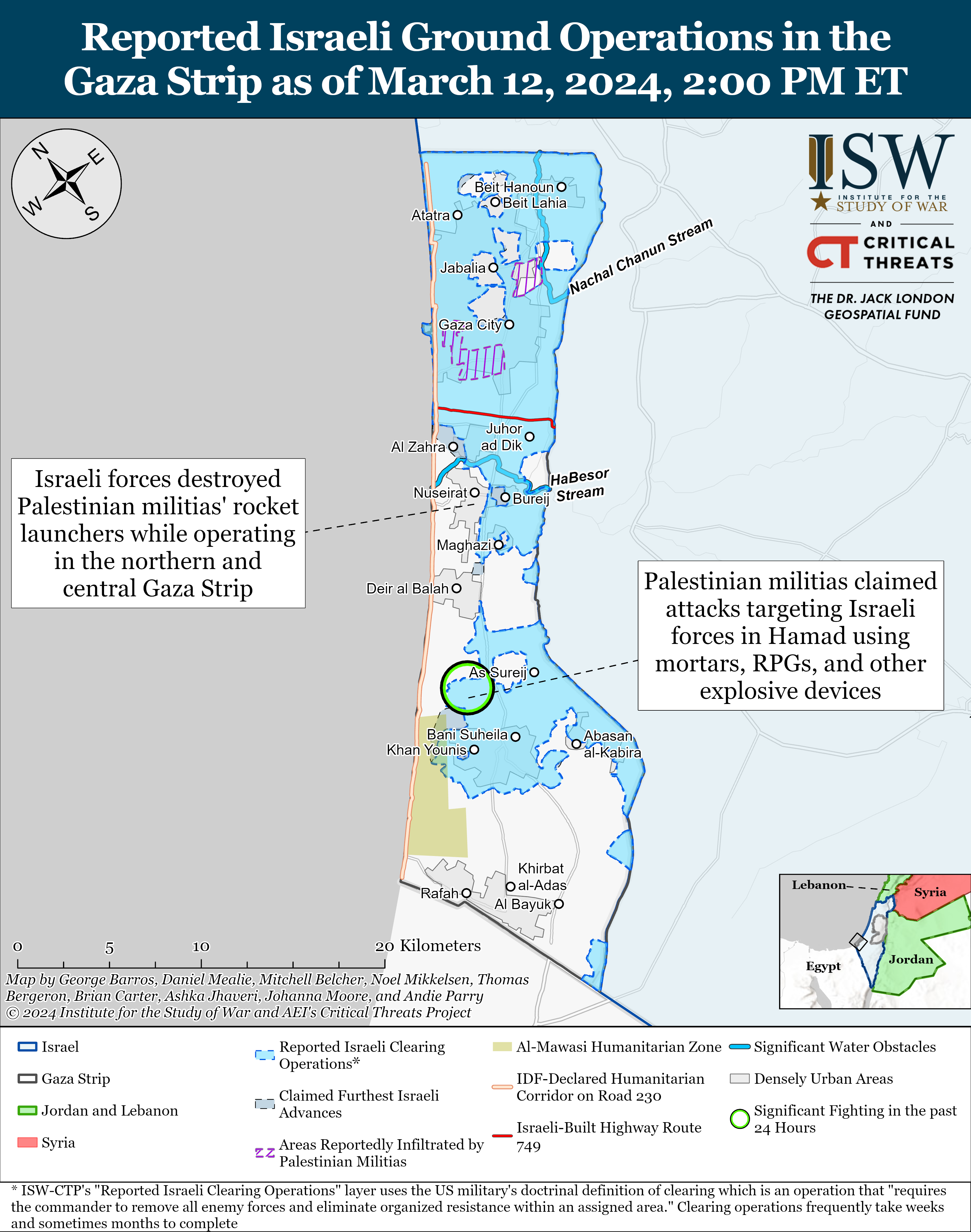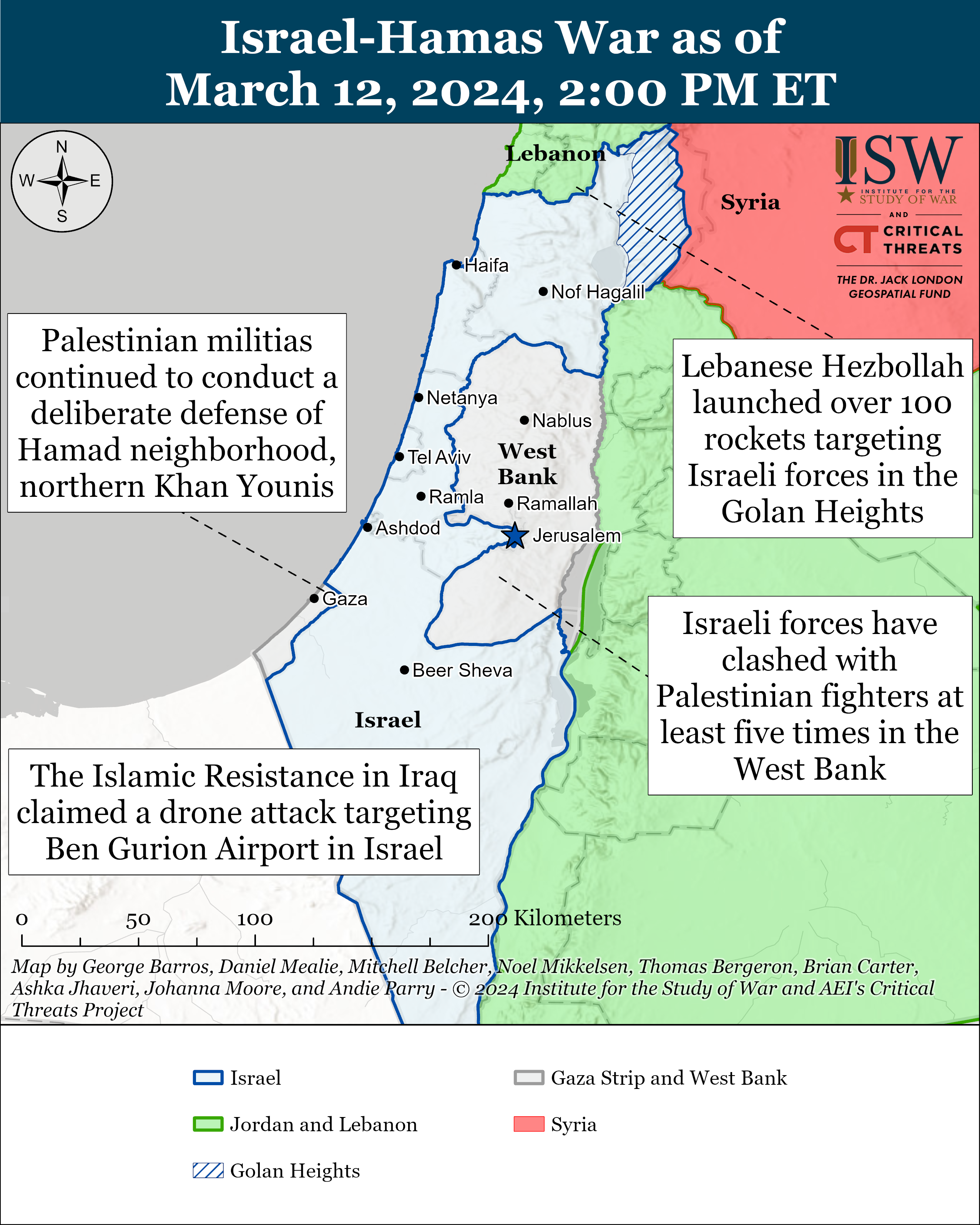 Palestinian militias continued to conduct a deliberate defense of Hamad neighborhood, northern Khan Younis, on March 12. Three IDF brigades have been clearing Hamad of Palestinian fighters and military infrastructure since March 3.[5] The IDF had intelligence that Palestinian fighters retreated from other areas in Khan Younis to hide in Hamad.[6] Israeli forces directed airstrikes to kill Palestinian cells and located weapons in buildings during clearing operations on March 12.[7] Four Palestinian militias claimed attacks targeting Israeli forces in Hamad using mortars, rocket-propelled grenades, and other unspecified explosive devices.[8]