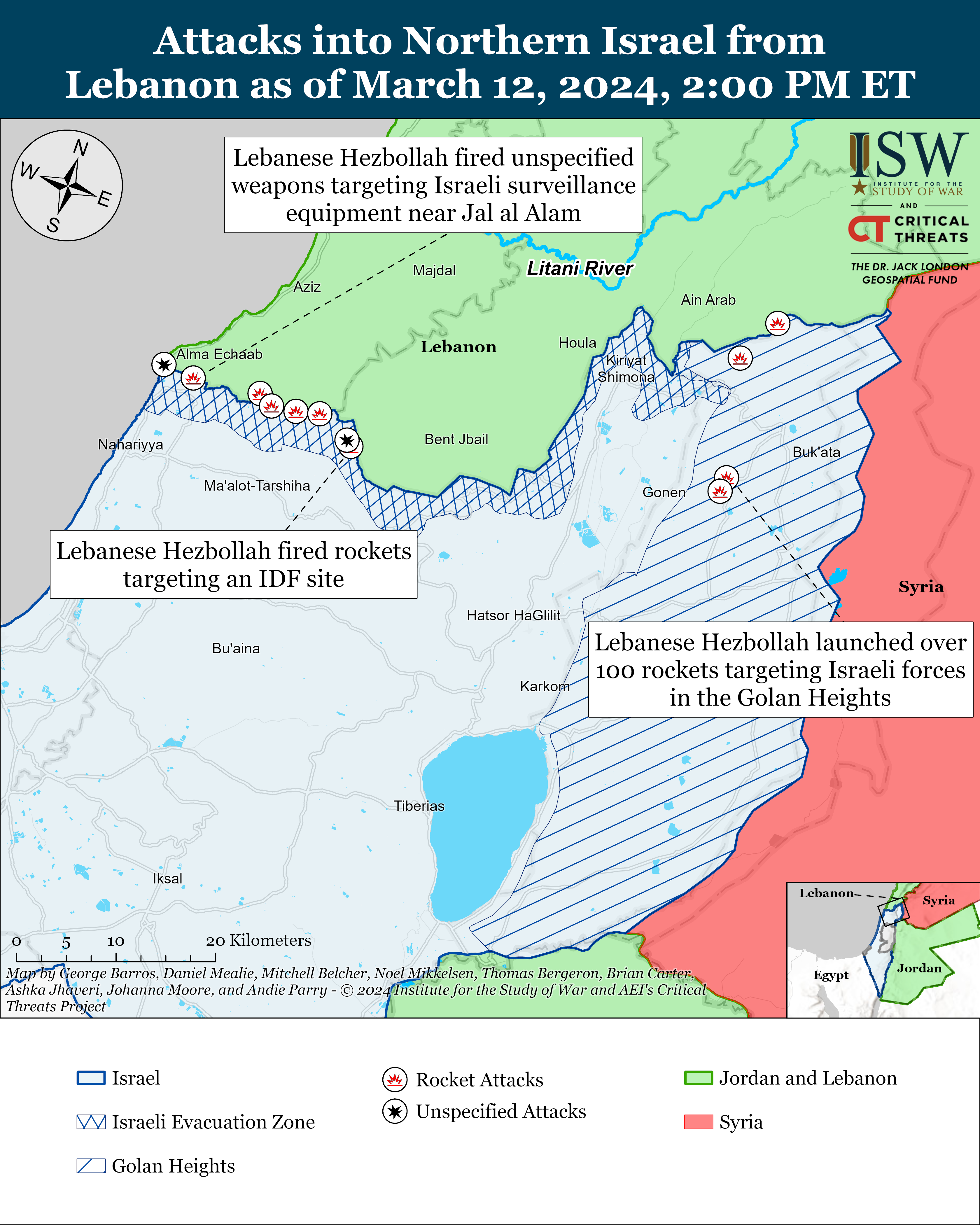 Iranian-backed militias, including Lebanese Hezbollah, have conducted at least 14 attacks from southern Lebanon into northern Israel since CTP-ISW’s last data cutoff on March 11.[33] Hezbollah launched over 100 rockets targeting Israeli forces in the Golan Heights.[34] This attack was one of the largest Hezbollah has conducted since the war began.