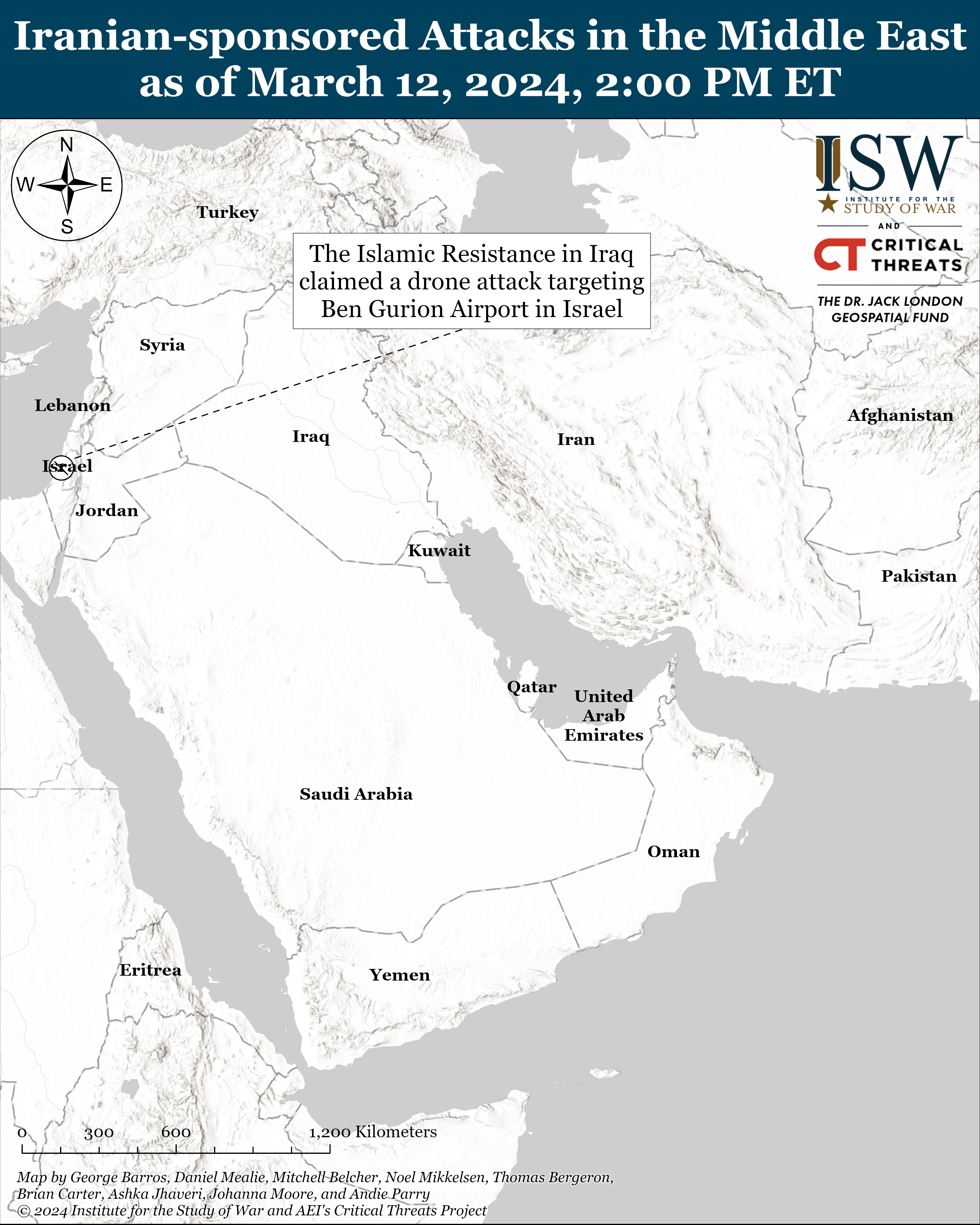 The Islamic Resistance in Iraq—a coalition of Iranian-backed Iraqi militias—claimed a drone attack targeting Ben Gurion Airport in Lod, Israel, on March 11.[47] The group described the attack as part of its “second phase of operations” to support Palestinians in the Gaza Strip.[48] CTP-ISW previously reported that the Islamic Resistance in Iraq appears to have refocused its attacks to target primarily Israel rather than US forces for the moment.[49] The Islamic Resistance in Iraq has not attacked US forces since February 4 but has claimed 10 attacks targeting Israel during this same period.[50] It is unclear, however, how many of the Islamic Resistance in Iraq’s attacks targeting Israel have succeeded.