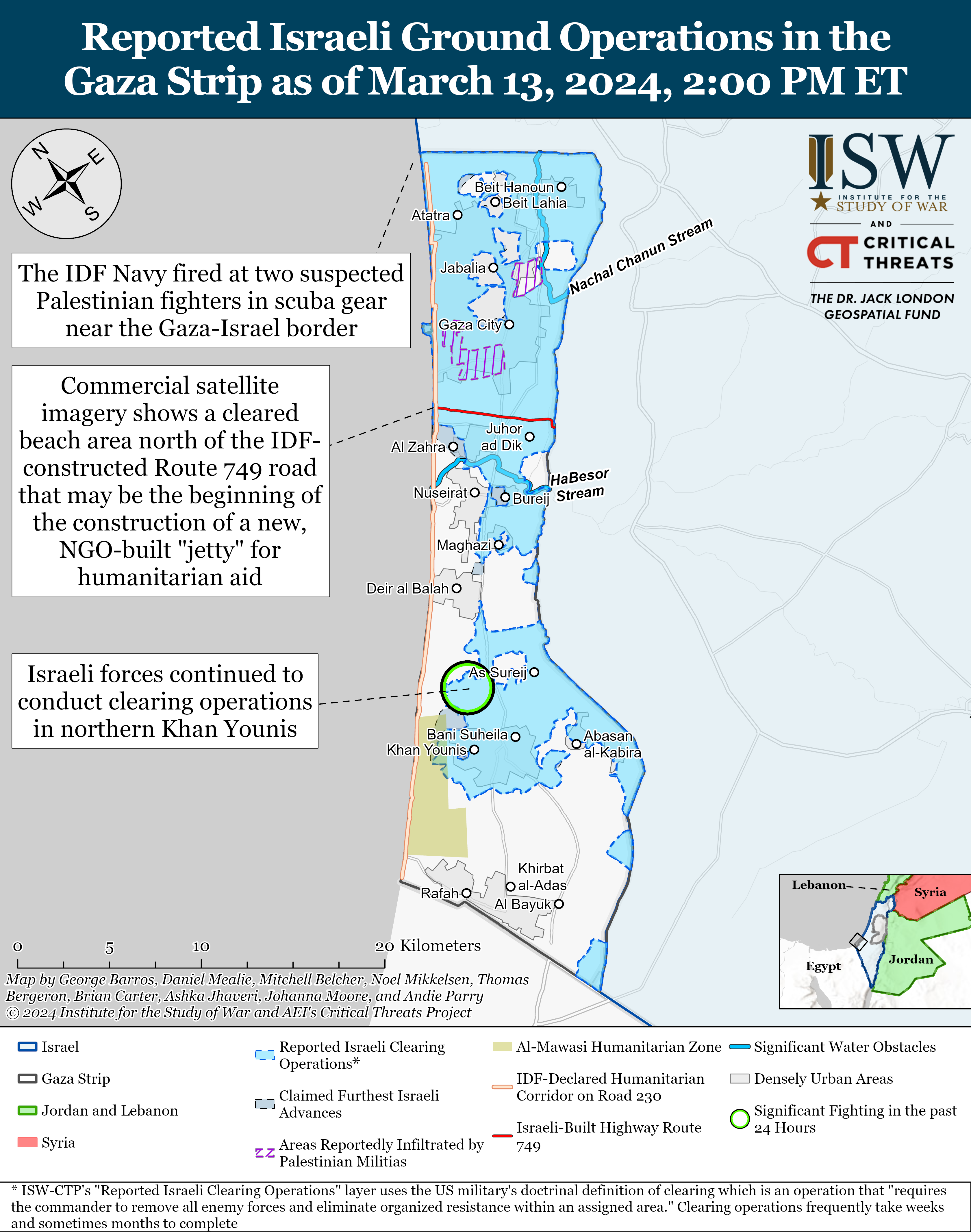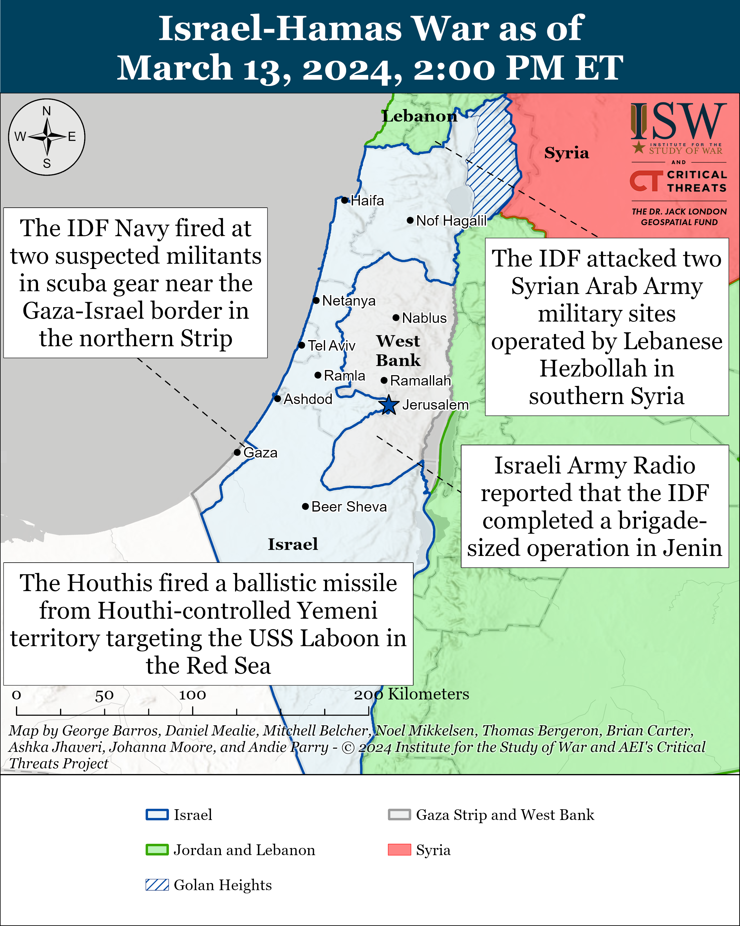 Israeli media reported on March 13 that the Israel Defense Forces (IDF) Navy fired at two suspected Palestinian fighters in scuba gear approaching the border between the northern Gaza Strip and Israel.[1] CTP-ISW has not recorded Palestinian fighters attempting to infiltrate into Israel from the Gaza Strip since early November 2023.[2] An IDF Navy helicopter destroyed an unspecified Palestinian vessel near Gaza City on March 11.[3]