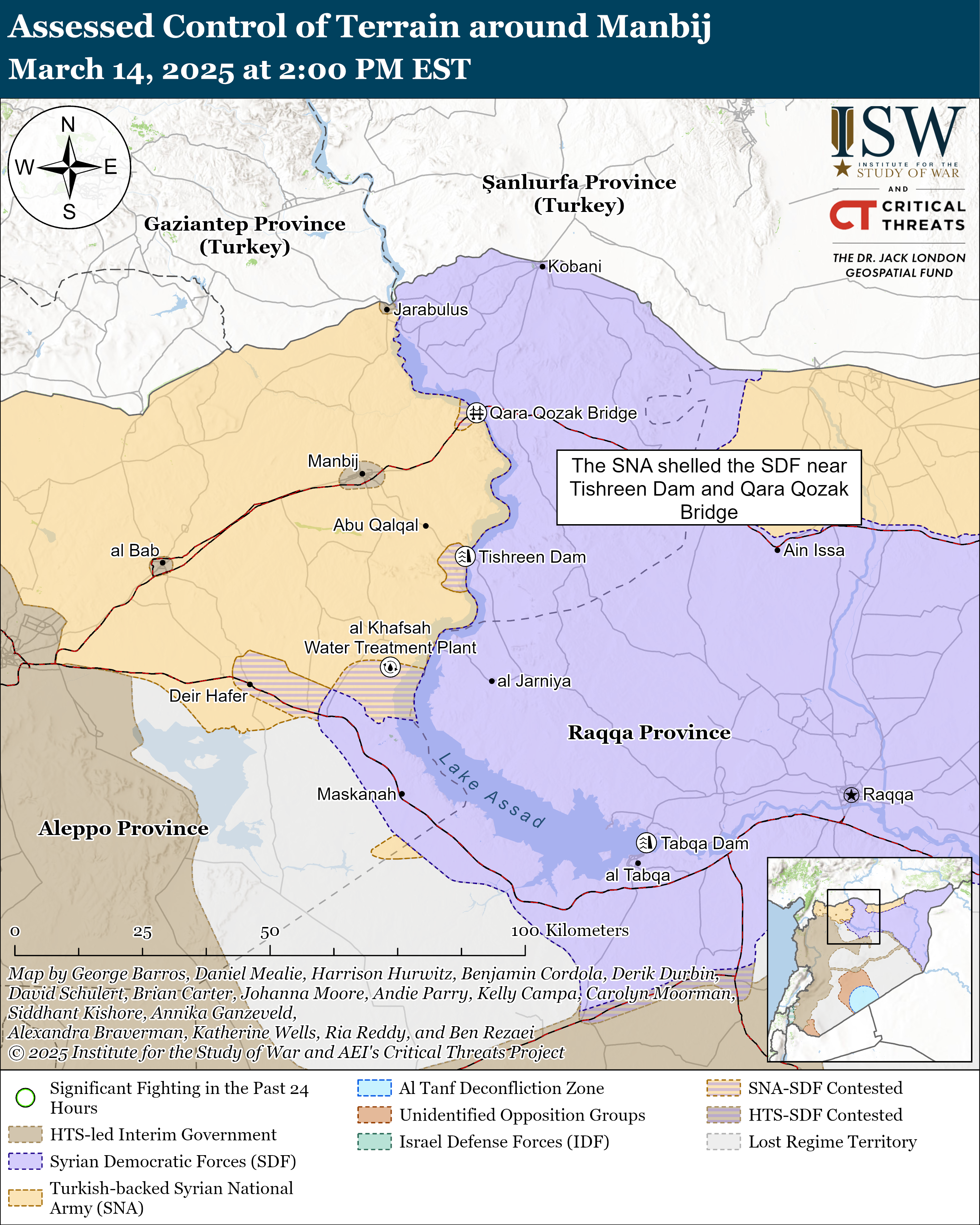 The SNA shelled SDF positions near Tishreen Dam and Qara Qozak Bridge on March 14.[35]