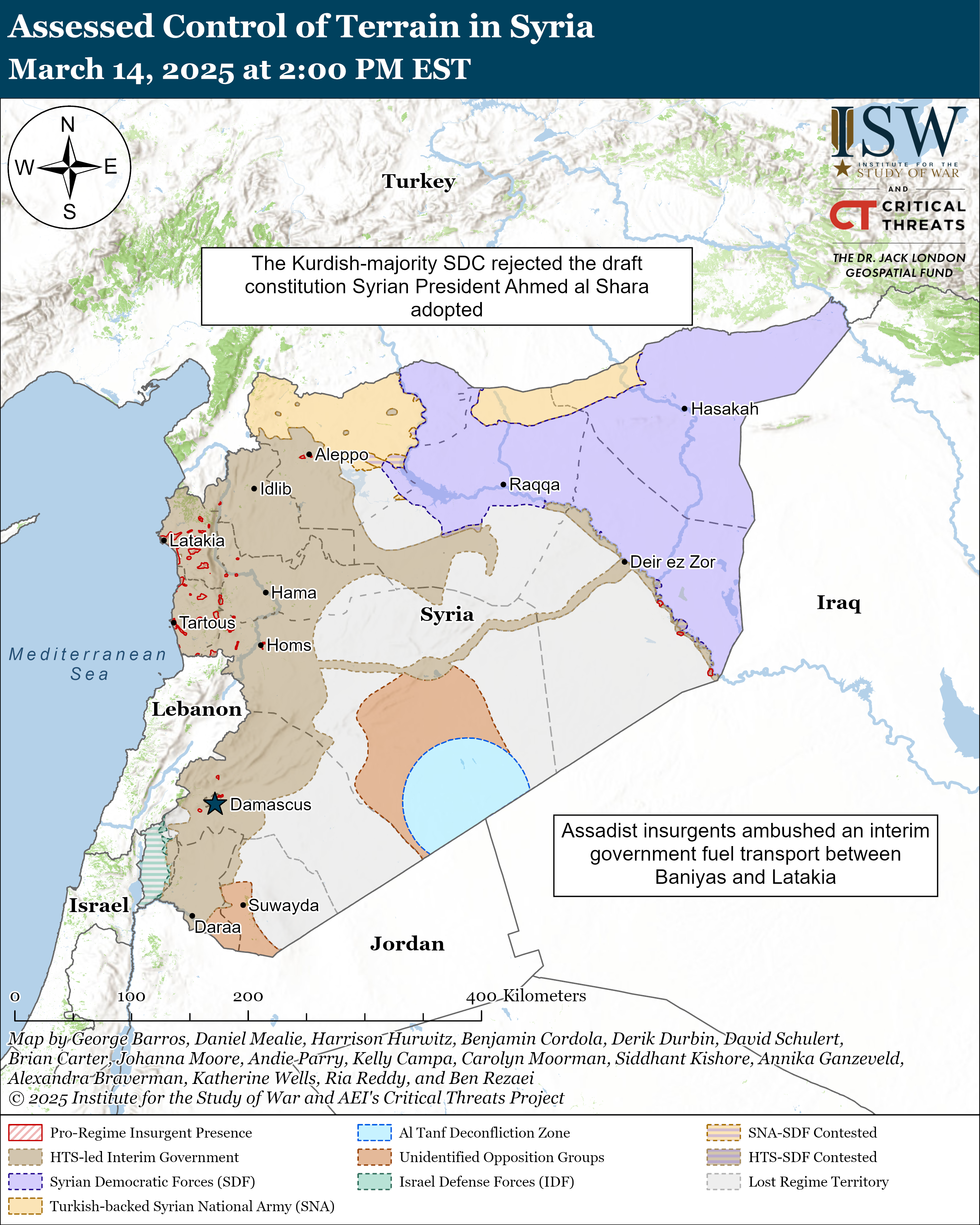 The Kurdish-majority Syrian Democratic Council (SDC) rejected the draft constitution that Syrian President Ahmed al Shara adopted on March 13.[7] The SDC is the political wing of the Syrian Democratic Forces (SDF) in the Autonomous Administration of North and East Syria (AANES). The AANES similarly stated on March 13 that the constitution was too like the Bashar al Assad regime’s constitution and noted that the focus on Arab identity is a “de-facto falsification of Syria’s national and societal identity.”[8] The SDC claimed that the constitution “grants the executive authority absolute powers, while restricting political activity” and obstructs democratic transition.[9] CTP-ISW noted on March 13 that Shara could use some of the articles in the constitution to consolidate his power over the Syrian state.[10]