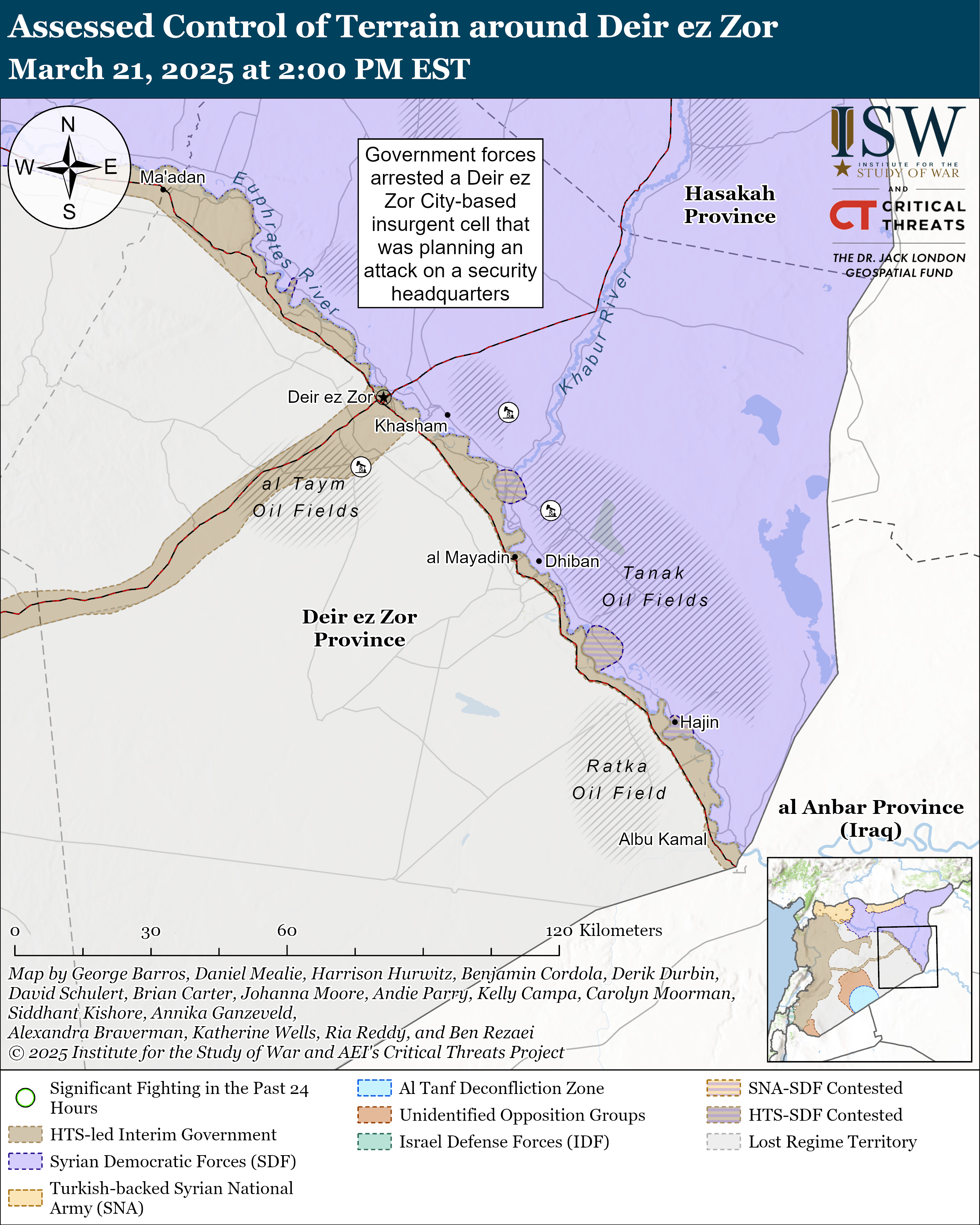 - Other Insurgent Elements in Syria: Syrian government forces continued raids and arrests targeting elements of nascent insurgent networks elsewhere in Syria. Government forces arrested a Deir ez Zor City-based insurgent cell affiliated with the US-sanctioned Qaterji Company on March 20 that was planning an attack on a security headquarters.