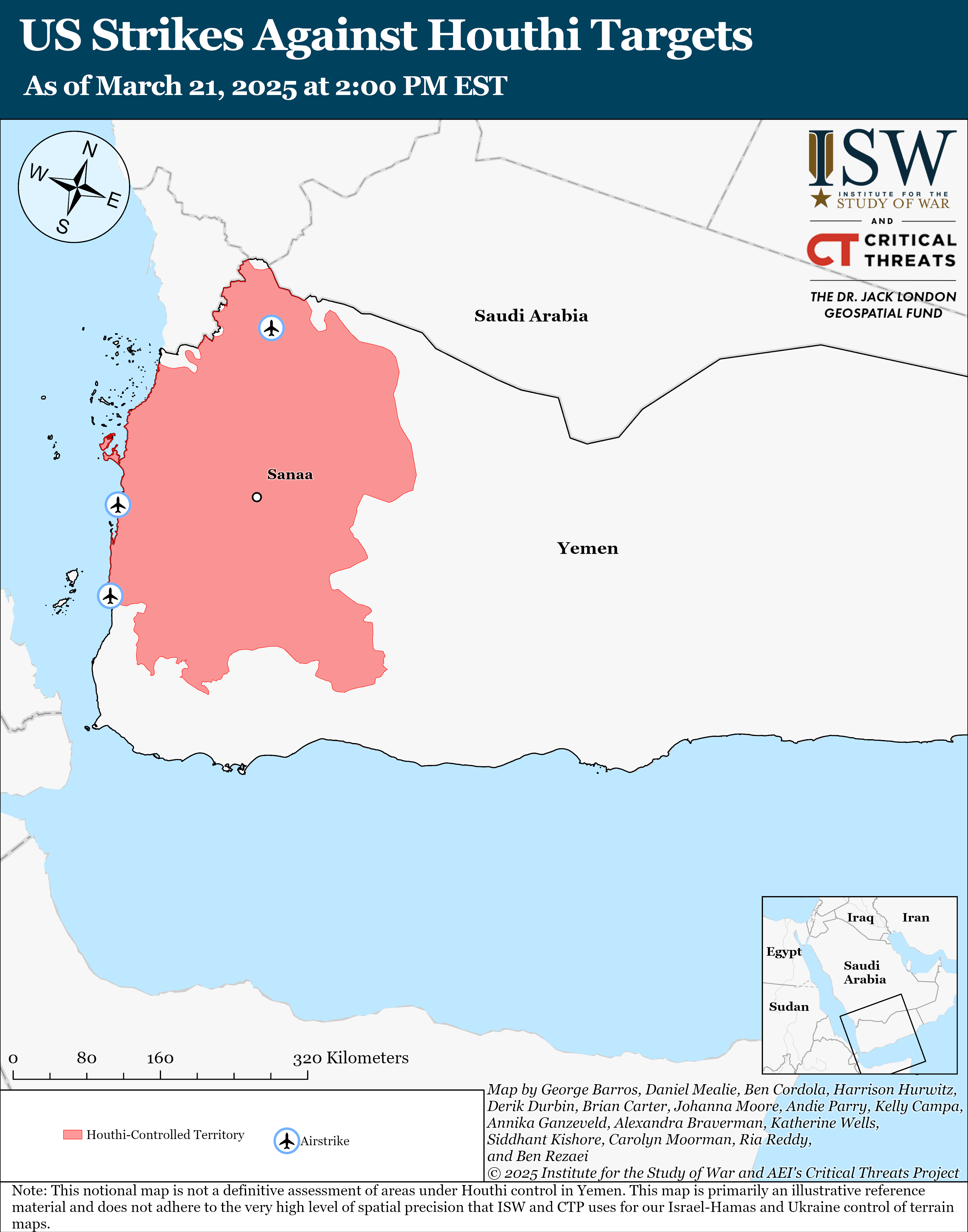 US Central Command (CENTCOM) has conducted at least seven airstrikes targeting Houthi infrastructure in Houthi-controlled areas of Yemen since CTP-ISW’s last data cutoff on March 20.[8] CENTCOM reportedly targeted a Houthi military base in the al Fazah-al Tuhayta area, south of Hudaydah Port.[9] CENTCOM also struck an unspecified location near Safraa in the Houthi stronghold of Saada City on March 20.[10] The Houthis did not launch retaliatory attacks targeting the Truman, as it has done previously.[11]