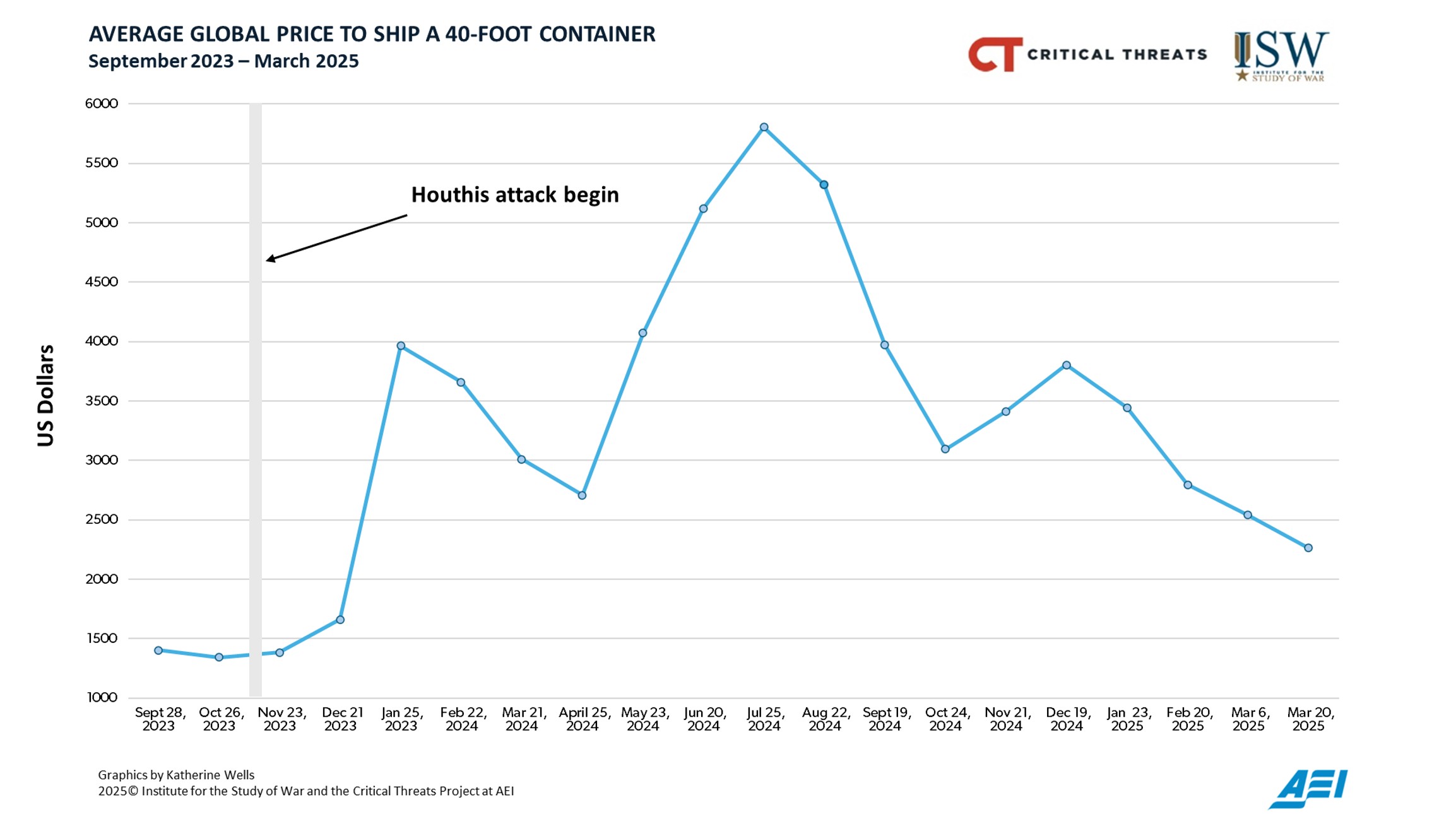 Shipping companies are set to avoid the Red Sea transit route until a more comprehensive peace agreement is reached, according to the New York Times.[17] Approximately 200 cargo ships transited the Bab el Mandeb Strait in the southern Red Sea near Yemen in February 2025.[18] Two hundred cargo ships still represent an increase from the 144 ships that transited the Red Sea in February 2024, but it is still significantly fewer ships compared to before the Houthi attack campaign targeting maritime shipping, according to the New York Times.[19] Global freight prices also remain significantly higher than before October 2023 though freight prices have decreased since December 2024, when the Houthis halted their attacks on international shipping.[20] The Houthis have not targeted commercial vessels in the Red Sea since announcing their resumption of attacks on ”Israeli shipping” on March 11.[21]