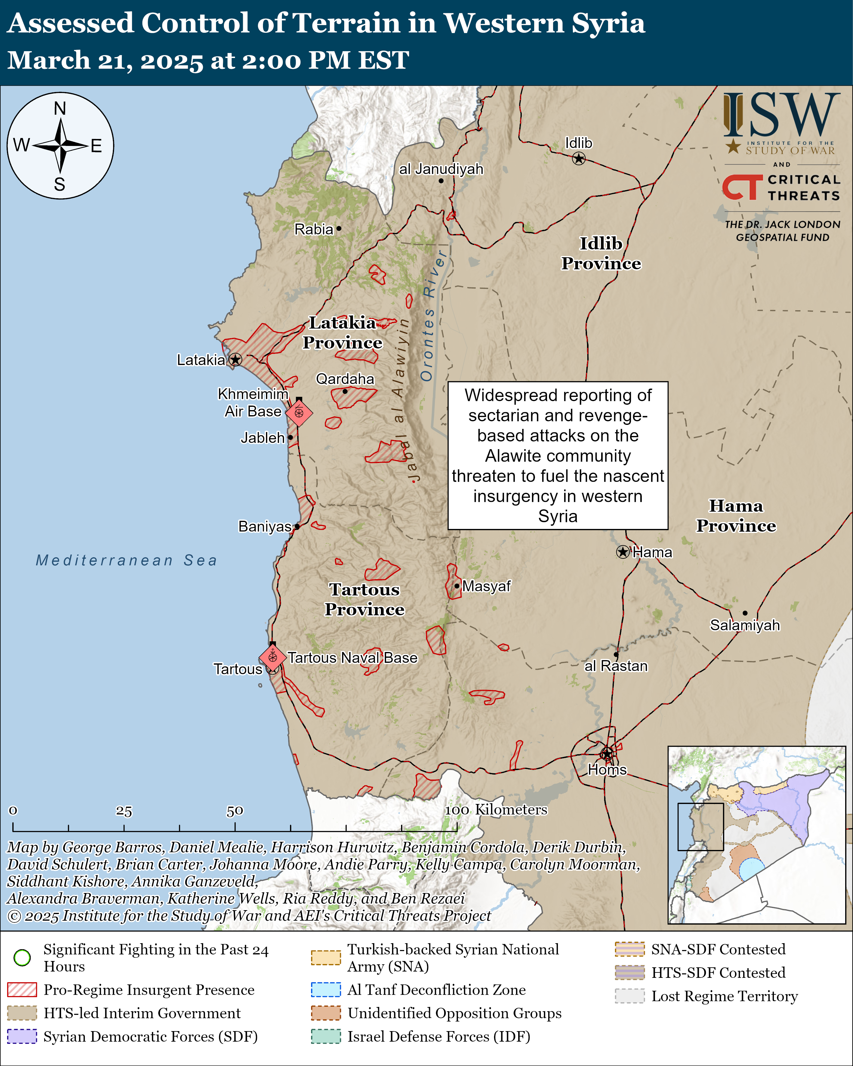 Widespread reports about likely Sunni-perpetrated sectarian and revenge-based attacks targeting the Alawite community threaten to fuel the Alawite insurgency in western Syria. Alawite media has widely reported on instances of violence committed against the Alawite community by Sunnis and government forces.[22] CTP-ISW cannot independently verify all of these reports at this time, but these reports will likely exacerbate Alawite distrust towards Sunni communities and Sunni-majority security forces. This distrust delegitimizes the interim government among the population and could enable insurgents to move in as security guarantors for the Alawite community.[23] Insurgent groups seek to exploit insecurity and abuses to control the population and establish themselves as the primary security guarantor in a community.[24] Failure by the interim government to hold perpetrators of these abuses accountable and rebuild trust within the Alawite community will undermine any counterinsurgency campaigns.