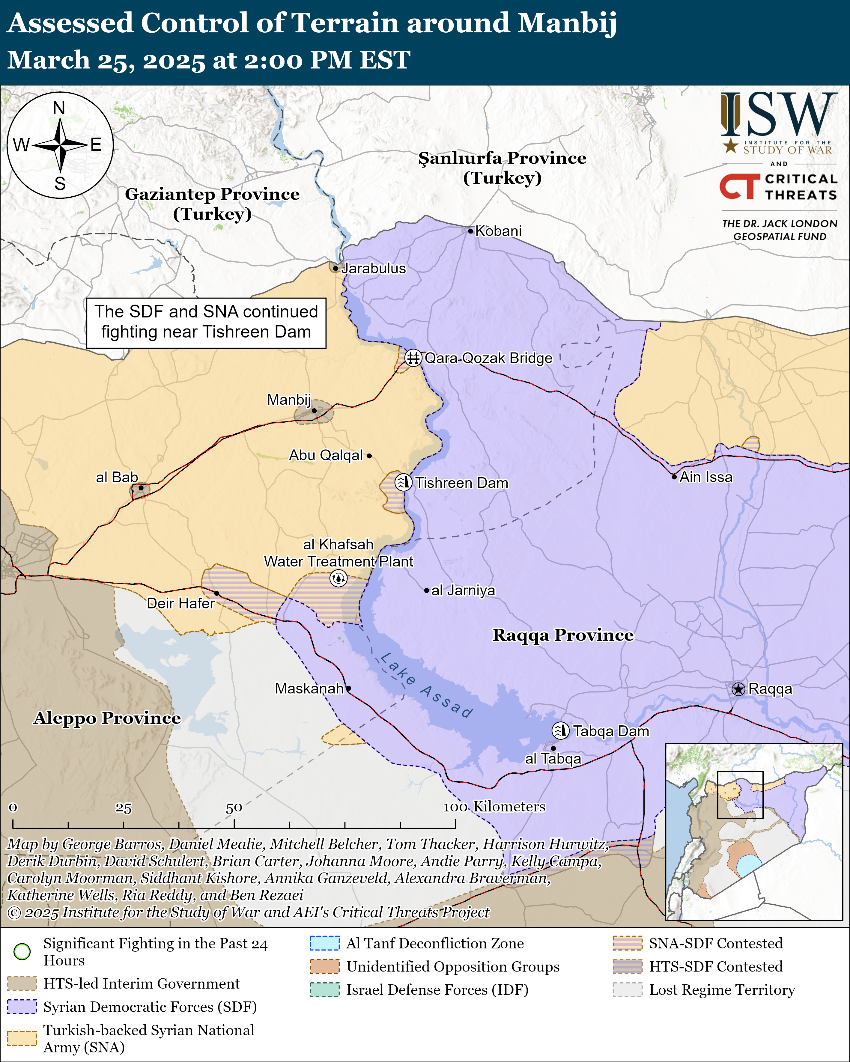 The SDF and SNA continued fighting along the Tishreen Dam frontlines in eastern Aleppo on March 24.[21]