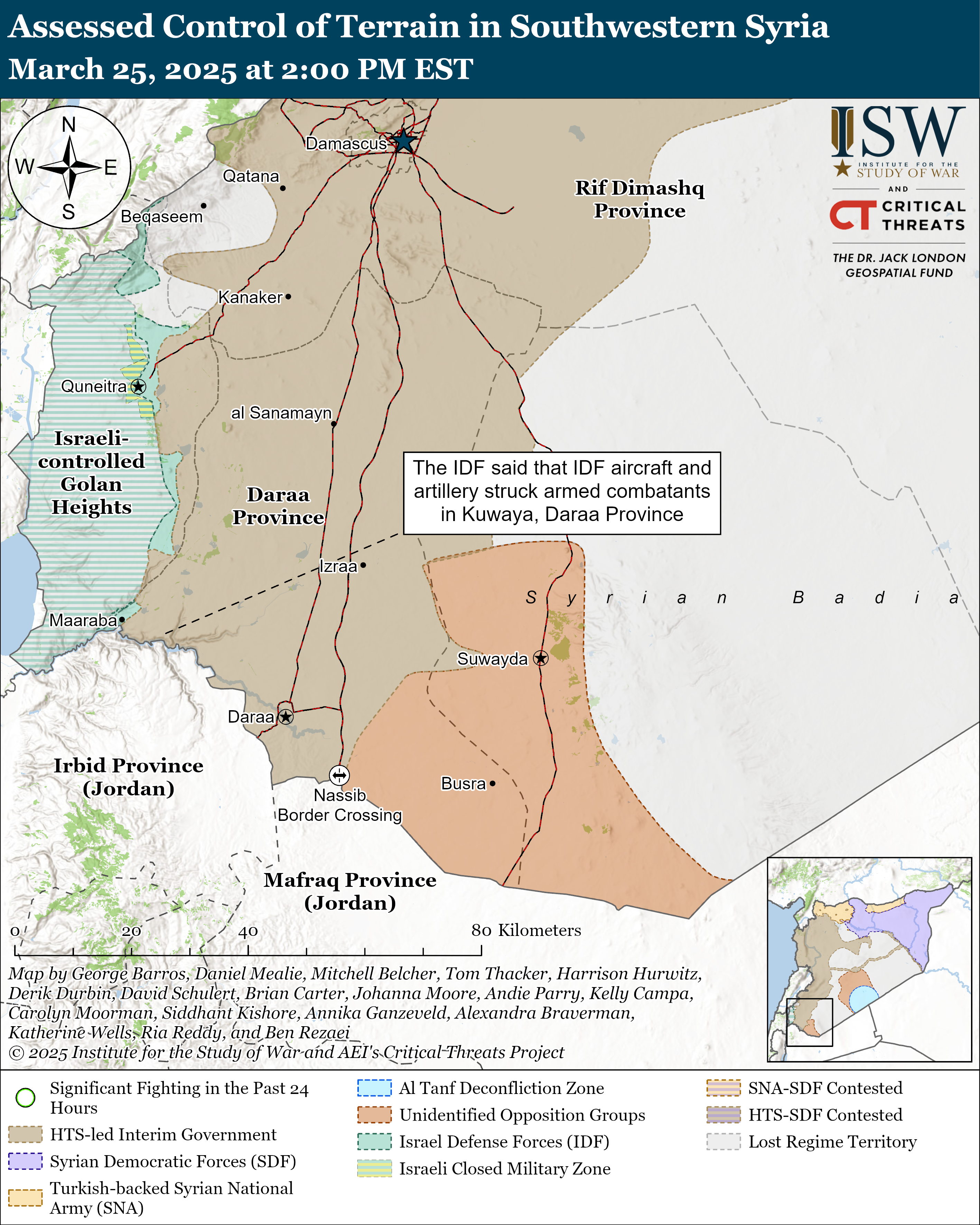 The IDF conducted airstrikes and artillery shelling targeting armed combatants in the southern Syrian village of Kuwaya, Daraa Province, on March 25.[29] Armed combatants, including armed villagers, attacked the IDF when Israeli forces entered Kuwaya on March 25.[30] The IDF returned fire and conducted an airstrike that killed at least four fighters of the Islamic Resistance Front of Syria-the First of the Brave, in Kuwaya.[31] The Islamic Resistance Front in Syria-the First of the Brave is an anti-Israeli militia that uses Iranian iconography common among groups affiliated with or inspired by the Iranian Islamic Revolutionary Guards Corps. The group announced its formation on January 9, 2025.[32] The IDF also shelled Kuwaya from an IDF base in Marbah village, Daraa Province, which is around 3.5 kilometers west of Kuwaya.[33] The shelling reportedly killed seven civilians in Kuwaya.[34] The IDF previously briefly operated in Kuwaya in December 2024 and withdrew after residents demonstrated against IDF presence.[35] The Syrian interim foreign ministry issued a statement that condemned Israeli operations in southern Syria.[36] The ministry called Israeli strikes in Kuwaya a “dangerous escalation” and called for an international investigation against Israeli activities in Syria.