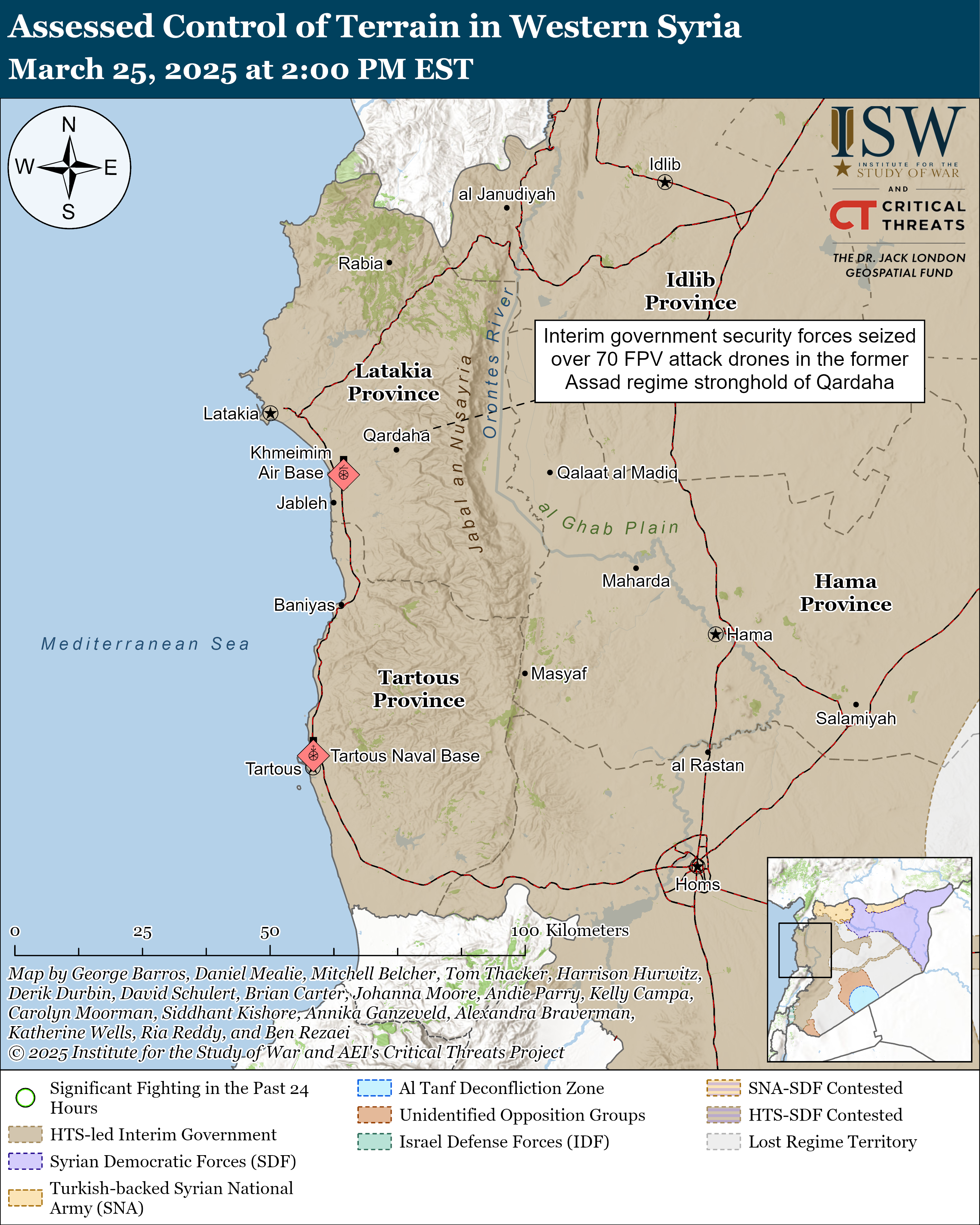 Interim government security forces seized at least 70 first-person view (FPV) attack drones from Qardaha, Latakia Province, on March 25.[37] The Public Security Directorate said that the drones were prepared to target interim defense ministry and internal security sites.[38] Qardaha is Bashar al Assad’s hometown and a former Assad regime stronghold.[39] Qardaha and its surrounding neighborhoods are likely support zones for the pro-Assad insurgency that was responsible for a spate of violence in early March. Qardaha residents demonstrated against interim government forces operating in Qardaha and called for their removal prior to the violence in early March, which suggests that the population may be sympathetic to pro-Assad insurgent cells and support their activity.[40] Insurgents in Qardaha fled to nearby hills on March 7 after interim government forces began clearing operations in the area.[41] The insurgency has continued sporadic attacks on interim government forces but has not used FPV drones in those operations.[42] The interim interior ministry said that the “Civil Peace Committee in Qardaha” agreed to turn over the drones to the government, suggesting that not all local officials support the Assadist insurgents.[43]