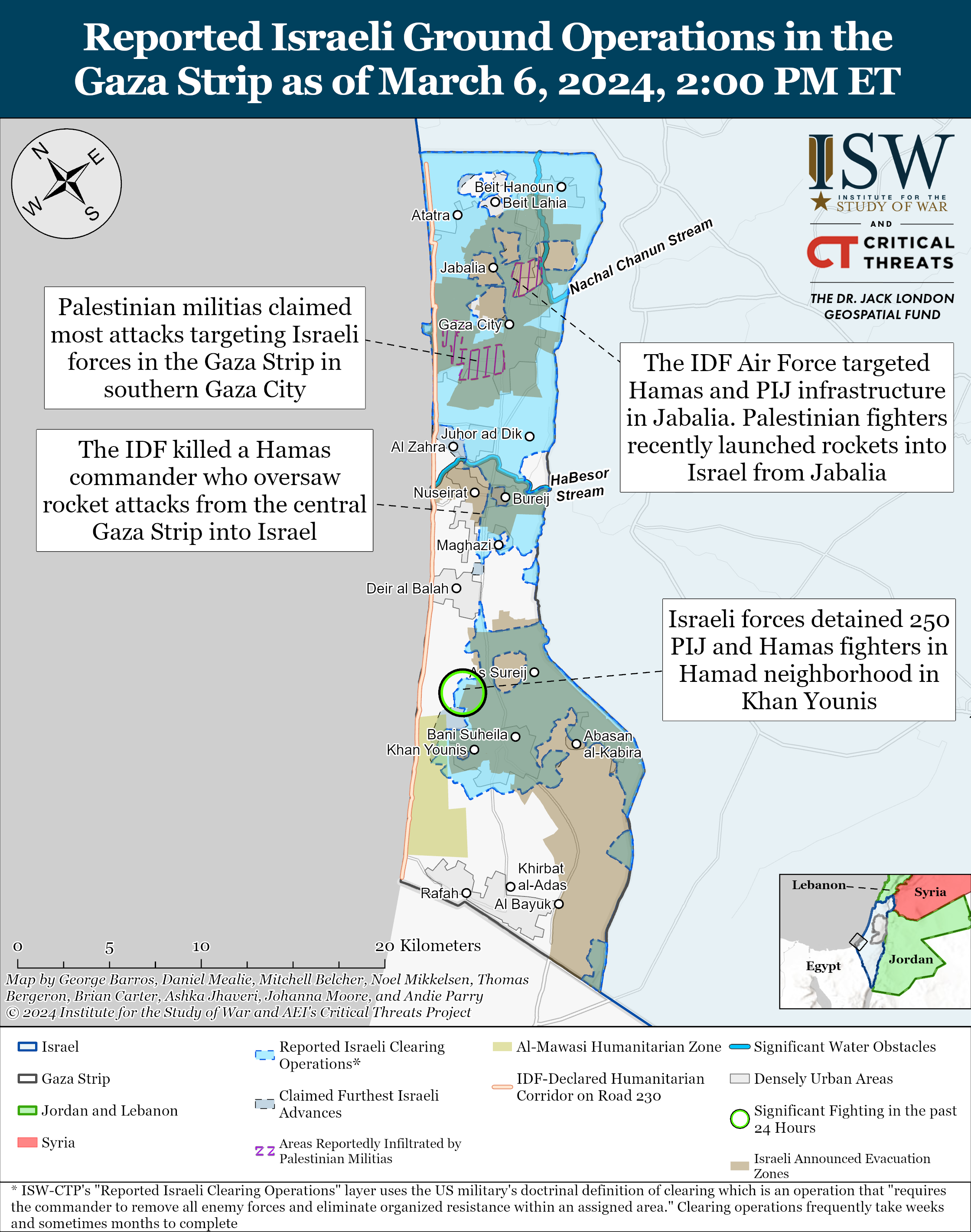 - Negotiations: Hamas said on March 6 that it will continue ceasefire negotiations and claimed that it has “shown flexibility” in the talks. Egyptian officials with knowledge of the talks told the Wall Street Journal on March 6 that Egyptian intelligence chief Abbas Kamal prevented Hamas from walking away from negotiations.