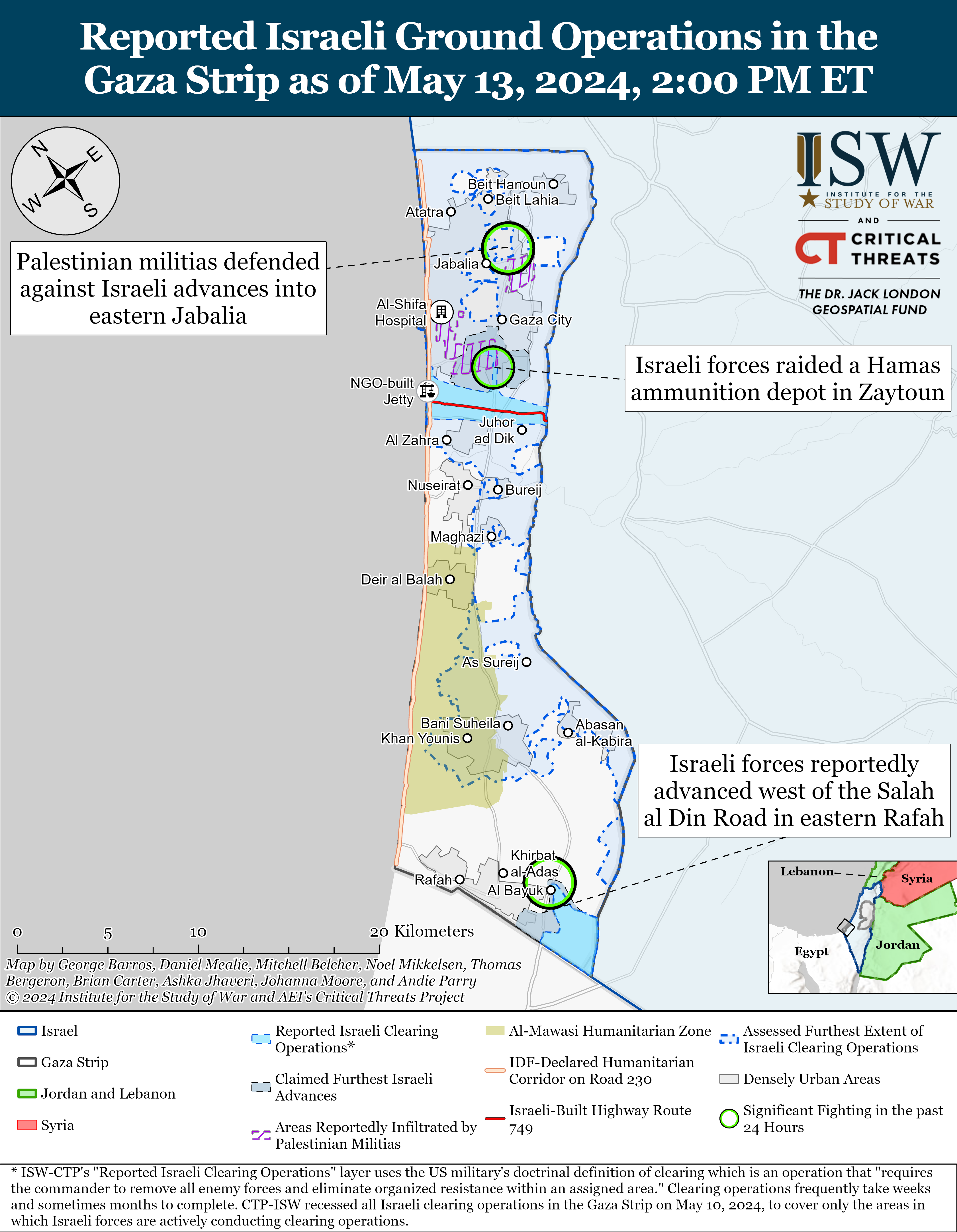 Israeli forces continued to conduct a clearing operating in eastern Rafah and at the Rafah border crossing with Egypt on May 13. The IDF Givati Brigade launched a “targeted brigade attack” against Hamas in an unspecified area of eastern Rafah, killing several Palestinian fighters.[10] The IDF 401st Brigade raided military infrastructure and found weapons in a school.[11] Israeli forces reportedly advanced west of the Salah al Din Road in eastern Rafah.[12] Palestinian militias used a variety of weapons, including explosively-formed penetrators, against Israeli forces in eastern Rafah.[13] Hamas mortared Israeli forces at the Rafah border crossing, which caused 10 IDF casualties.[14] An Israeli Army Radio correspondent noted that Hamas often targets static Israeli positions and is seemingly trying to range these targets.[15]