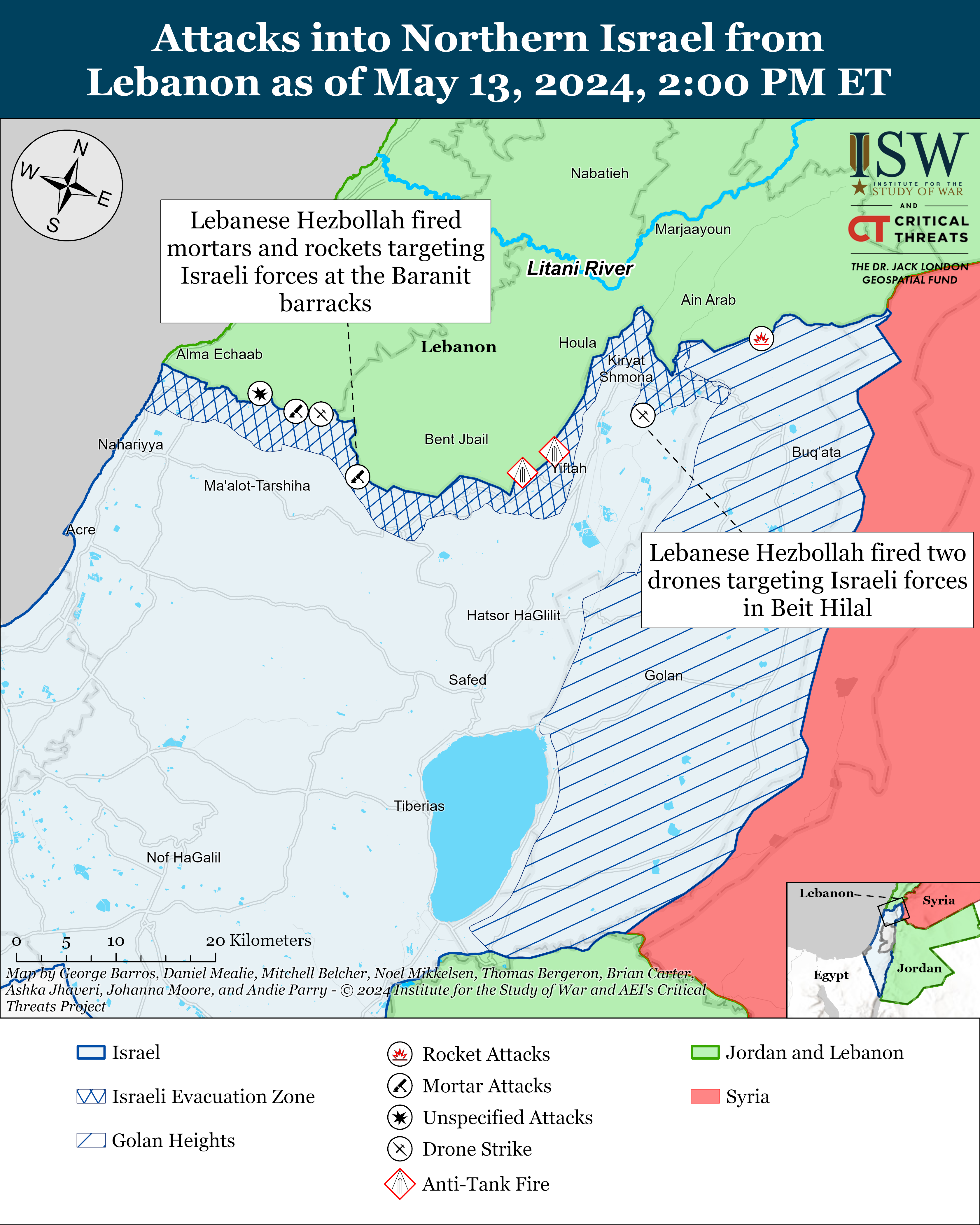 Iranian-backed militias, including Lebanese Hezbollah, have conducted at least eight attacks into northern Israel since CTP-ISW’s last data cutoff on May 12.[38] Hezbollah fired two drones targeting Israeli forces near Beit Hilel on May 13, marking the third Hezbollah drone attack targeting the area since May 11.[39]