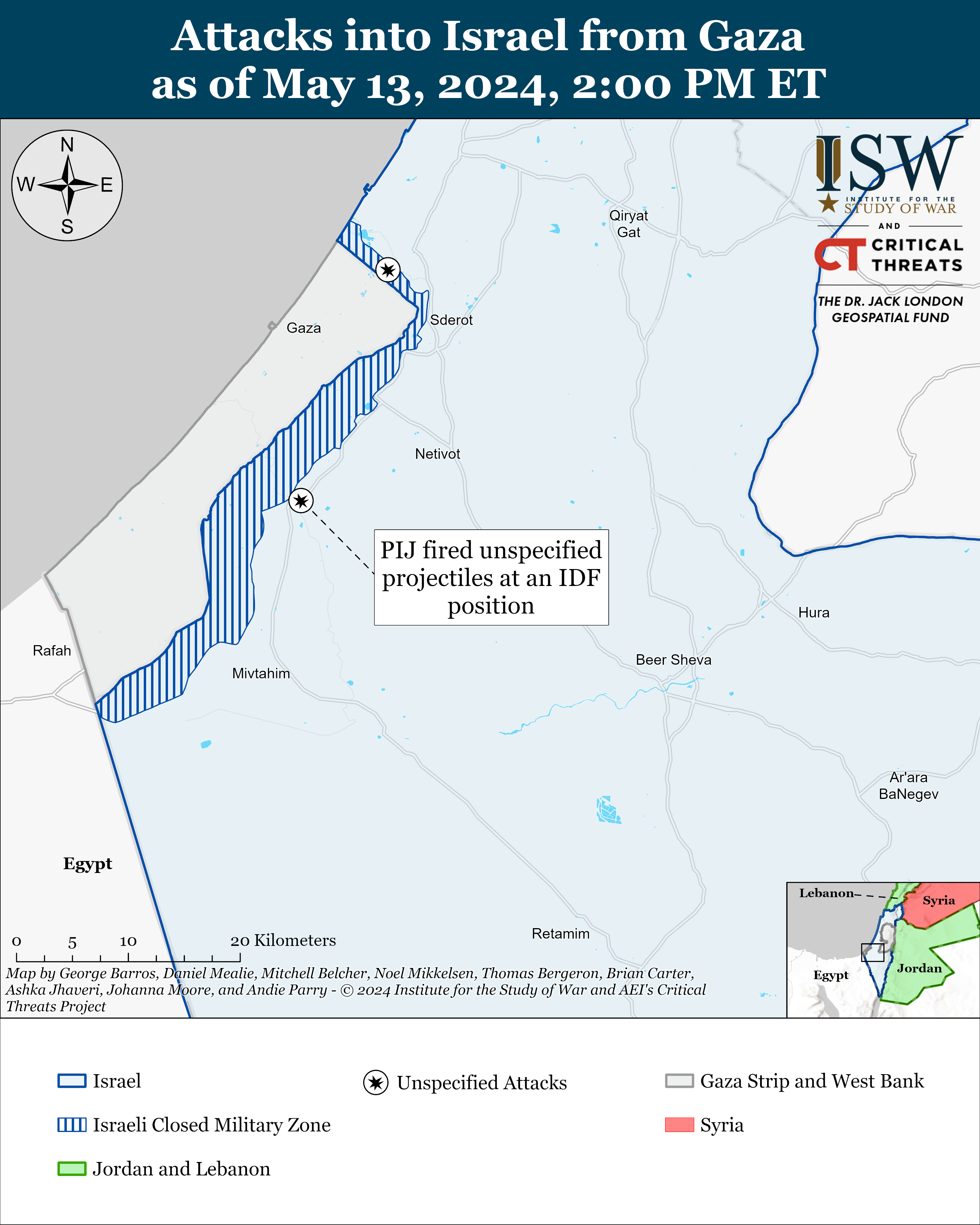 Palestinian militias have conducted two indirect fire attacks into Israel since CTP-ISW’s information cutoff on May 13. Palestinian Islamic Jihad (PIJ) fighters fired unspecified projectiles at an IDF position.[29] Israeli Army Radio reported that Palestinian fighters fired a projectile at Netiv Haasara, but the projectile fell in an open area.[30]