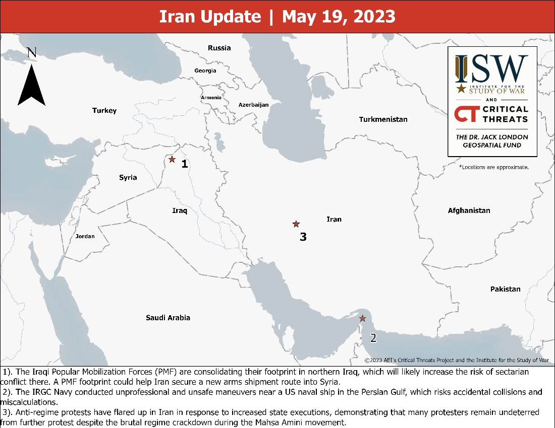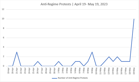 Anti-regime protests have flared up in Iran in response to increased state executions, demonstrating that many protesters remain undeterred from further protest despite the brutal regime crackdown during the Mahsa Amini movement. CTP recorded ten anti-regime protests on May 19—the highest number of anti-regime protests in a single day since March 13. Iranian authorities executed three individuals who participated in the Mahsa Amini protest movement on May 19 and has significantly increased the pace of state executions in recent weeks.[12] These executions reinvigorated anti-regime sentiments, as CTP previously forecasted.[13]