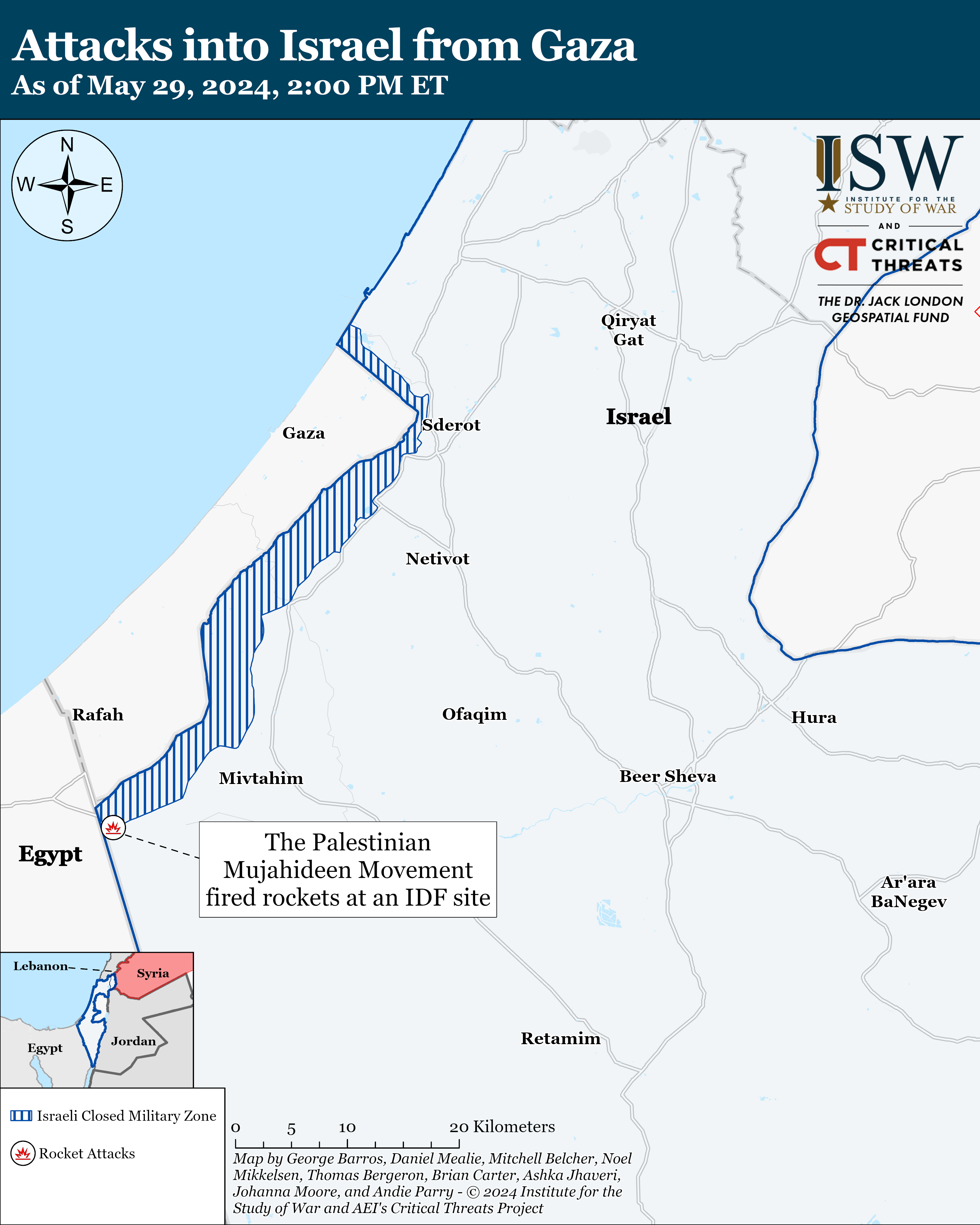 Israeli forces are currently operating along most of the corridor, excluding a small area near the Gazan coast. The IDF said that it controls the corridor with “surveillance and fire power.”[6] The IDF previously controlled about 70 percent of the corridor on May 22—two weeks after first advancing into Rafah on May 7.[7] The IDF said that Hamas has used the corridor to launch rocket attacks in recent weeks because Hamas assumed that the IDF would avoid the corridor so as to not inadvertently hit Egyptian territory.[8]