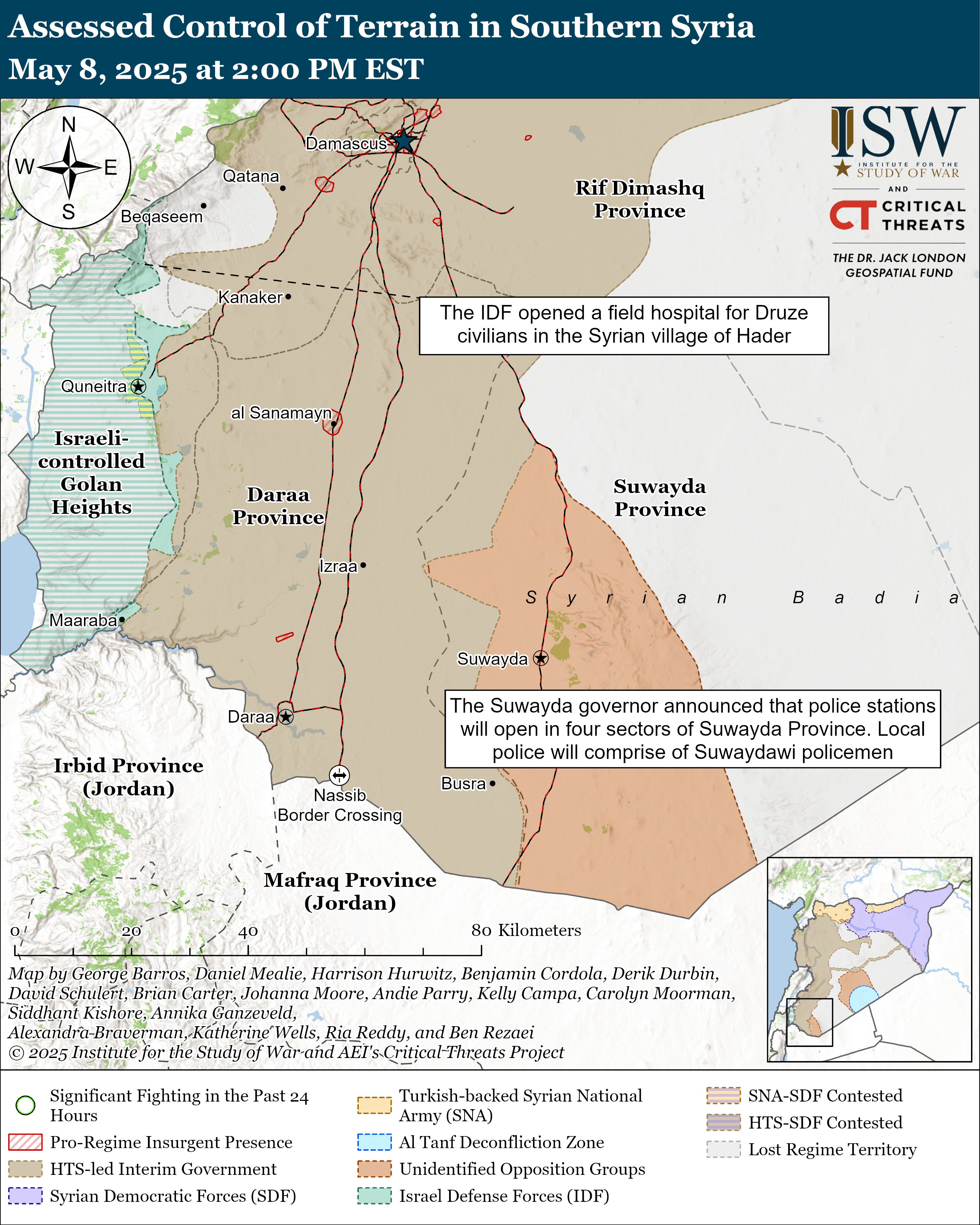 The Israel Defense Forces (IDF) opened a field hospital for Druze civilians in Hader, Quneitra Province, on May 8.[70] The IDF Arabic-language spokesperson announced that the field hospital is part of the IDF’s efforts to support the Syrian Druze population.[71] The IDF has been operating in Hader since December 2024.[72] The establishment of an IDF field hospital in Hader follows Israel’s efforts to pressure the Syrian transitional government to halt sectarian violence against the Syrian Druze community.[73]