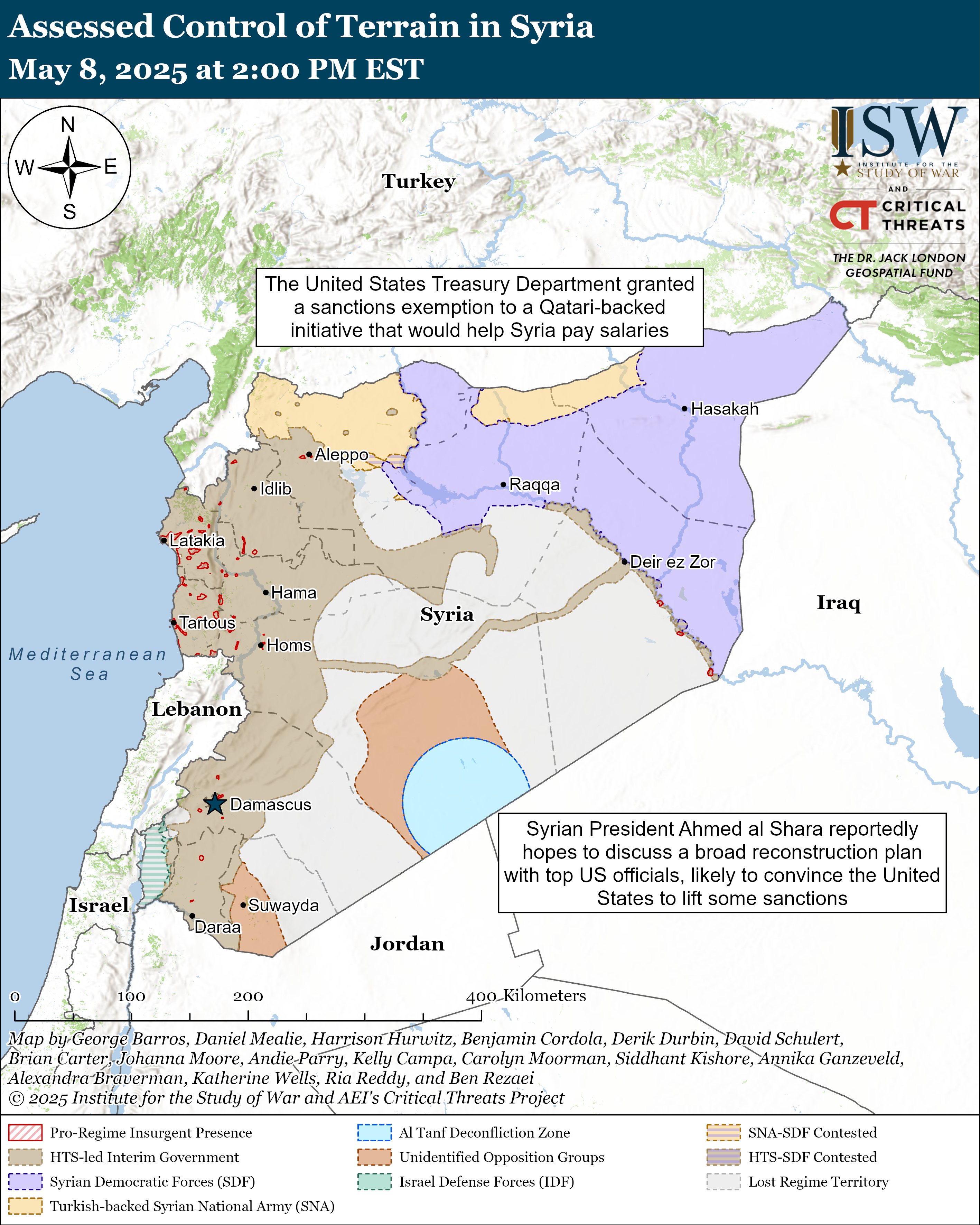 Syrian Transitional President Ahmed al Shara reportedly wants to discuss a broad economic reconstruction plan with US President Donald Trump, likely in part to secure US sanctions relief for Syria.[14] Unspecified Syrian transitional government officials told the Wall Street Journal on May 7 that Syrian President Ahmed al Shara wants to meet US President Donald Trump to discuss broad US investment and aid to rebuild Syria.[15] Shara reportedly requested to meet with Trump during Trump’s upcoming Gulf visit through US businessman and liquified natural gas (LNG) company CEO Jonathan Bass and Syrian Emergency Task Force head Mouaz Moustafa.[16] Bass and Moustafa met with Shara in Damascus on May 2 and presented him with a plan for Western firms to invest in Syria’s energy industry.[17] Syria has significant oil and gas infrastructure that needs to be rebuilt or updated after over a decade of civil war.[18] Bass and Moustafa said that Shara “responded favorably” to the idea of the United States’ waiving or lessening sanctions in order to make the investment possible.[19] An unspecified senior Syrian Foreign Affairs official confirmed Shara’s interest by telling Western media that Syria seeks a relationship with the United States that includes “energy and economic ties.”[20] Bass said that Shara and Syrian officials were also interested in participation from US companies in all areas of Syrian reconstruction.[21] The Trump administration has not yet acknowledged Shara’s reported request.