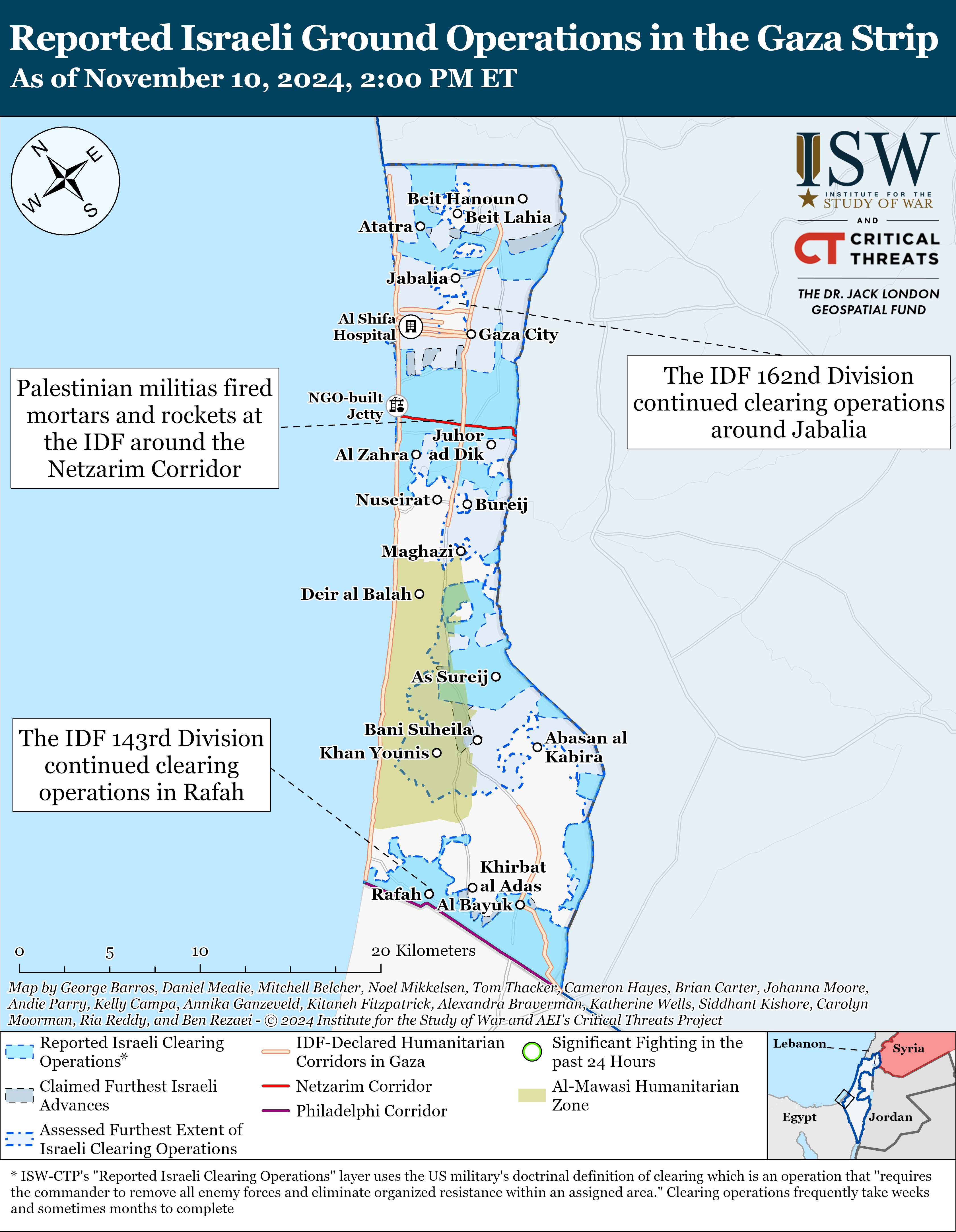The IDF 162nd Division continued clearing operations around Beit Lahia and Jabalia in the northern Gaza Strip on November 10. The IDF killed dozens of militia fighters and destroyed militia infrastructure, including a weapons depot.[28] The IDF 900th Infantry Brigade (162nd Division) targeted Palestinian fighters in Beit Lahia in airstrikes and close-range combat.[29] The brigade specializes in operations in urban environments and is well-suited to destroy militia cells within Jabalia City and refugee camp.[30]