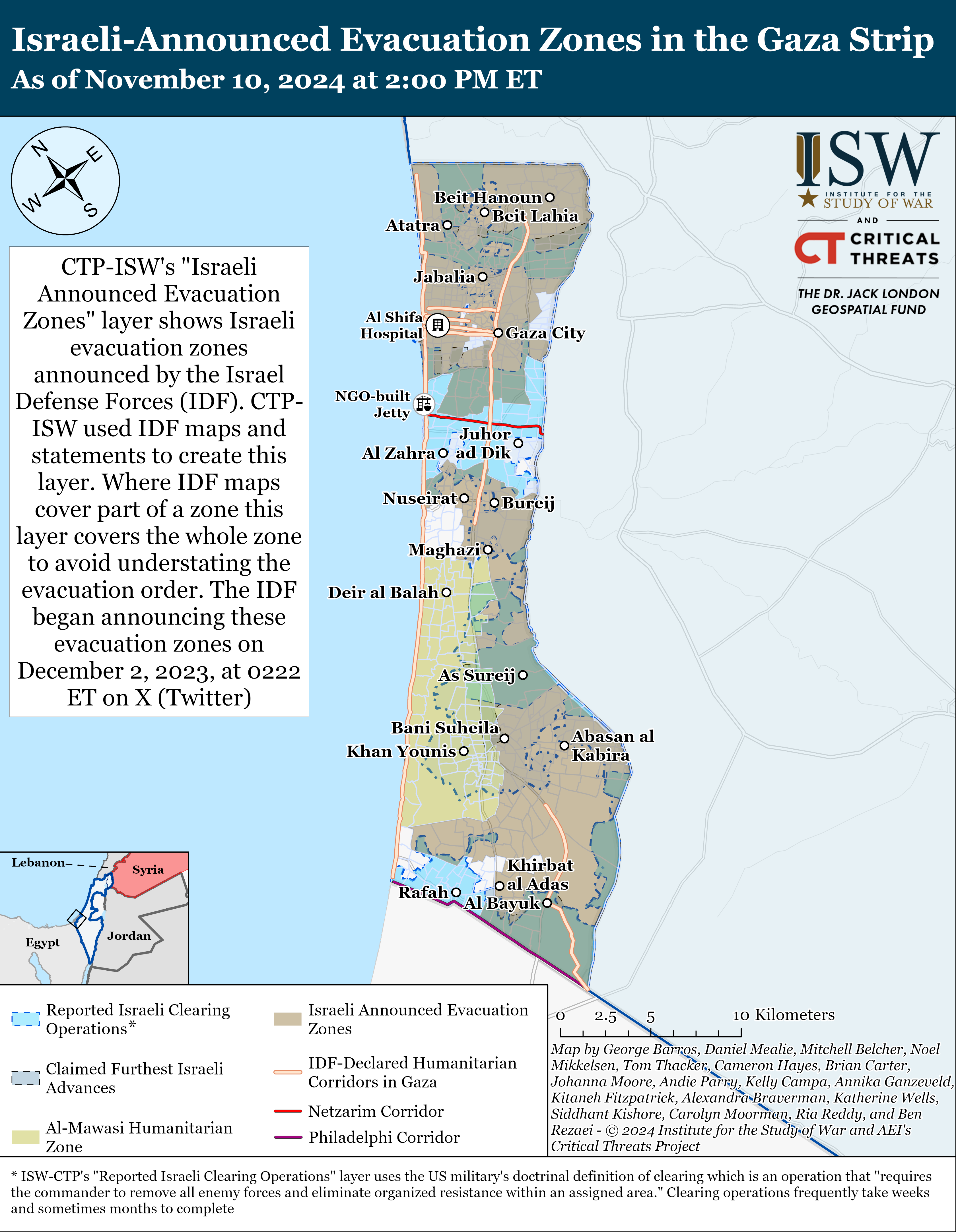 The Israel Defense Forces (IDF) has destroyed the ability of Lebanese Hezbollah to conduct ground attacks into Israel, according to unspecified senior IDF officers.[1] The IDF has conducted clearing operations targeting Hezbollah capabilities and infrastructure across southern Lebanon to this end since October 1. These clearing operations have involved destroying Hezbollah sites and seizing tens of thousands of weapons.[2] The IDF announced on November 10, for instance, that it destroyed a major underground complex near the Israel-Lebanon border that was meant to support Hezbollah incursions into northern Israel.[3] The IDF has especially focused on degrading the Hezbollah Radwan special operations forces during the clearing operations.[4] Eliminating the threat of ground attacks is critical to achieving the stated Israeli war aim of returning displaced civilians safely to their homes in northern Israel.