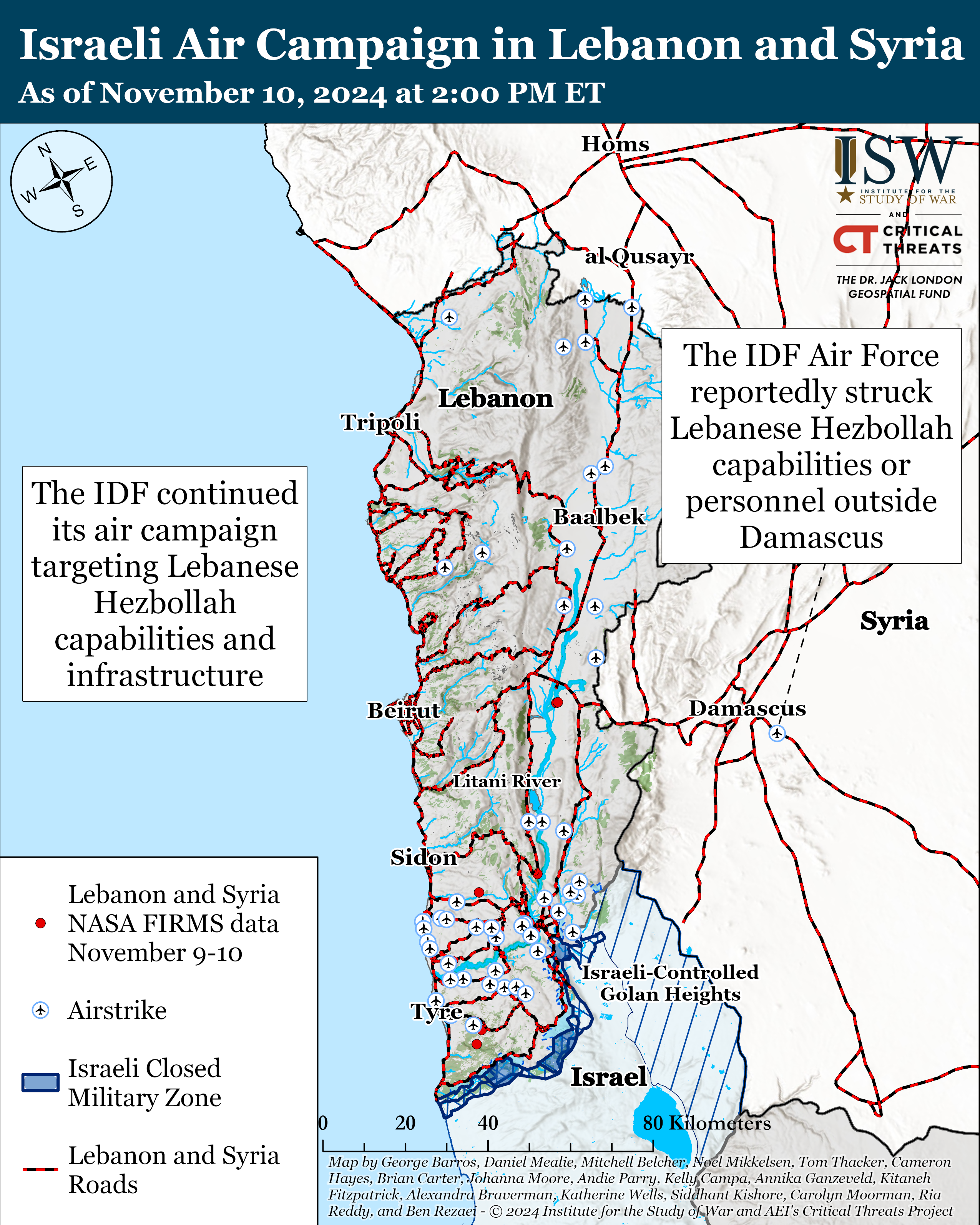 This map illustrates individual Israeli air and artillery strikes based on local Lebanese reporting. This map depicts strikes reported from 2:00pm ET on November 9 to 2:00pm ET on November 10. This map is not exhaustive. CTP-ISW cannot independently verify the locations of Israeli strikes.