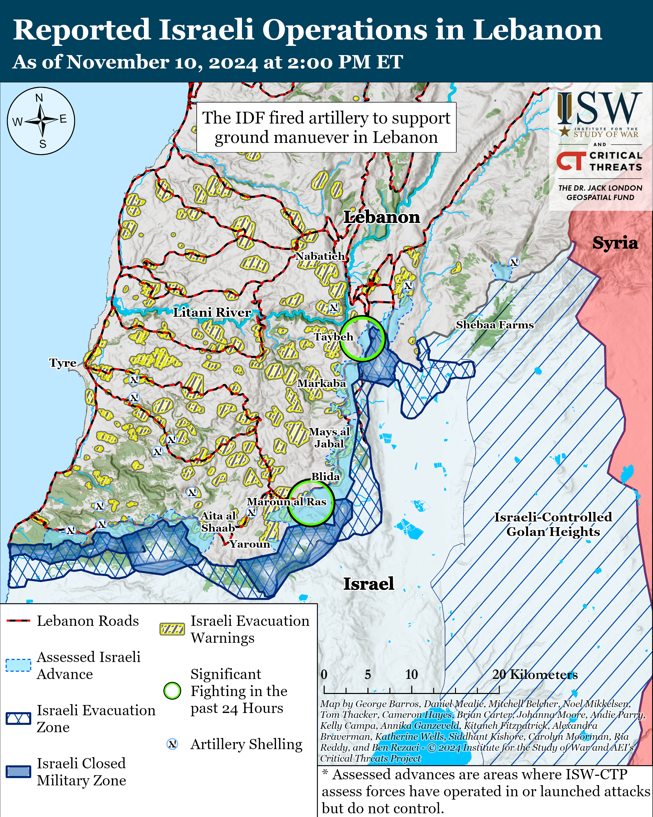 Hezbollah has claimed several attacks targeting the IDF in Aitaroun and Maroun al Ras since CTP-ISW’s last data cutoff on November 9. [52] Hezbollah fired rockets at the IDF south and east of Maroun al Ras.[53] Hezbollah also claimed that it engaged the IDF as it advanced into the southwestern outskirts of Aitaroun.[54] Hezbollah provided no evidence to support this claim.