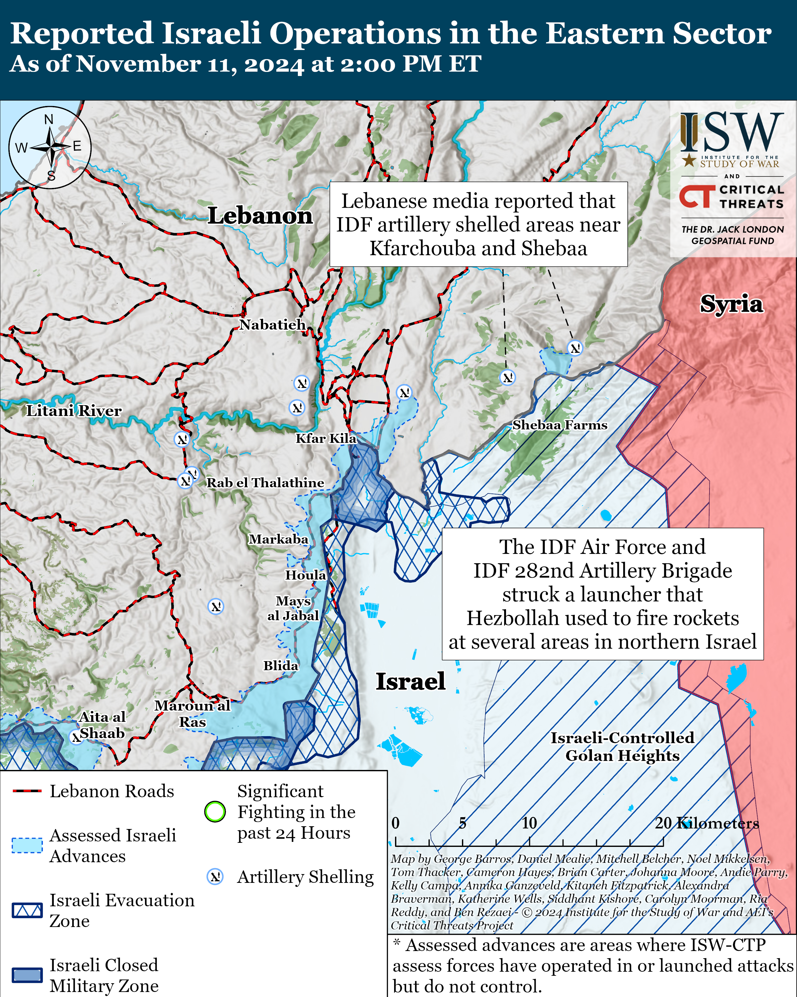Lebanese media reported that the IDF conducted artillery shelling near Kfarchouba and Shebaa in Hasbaya District, southeastern Lebanon, on November 11.[67] The IDF 810th Mountain Brigade has operated around the Hermon and Mount Dov areas since early October 2024 to locate and destroy militia infrastructure.[68]