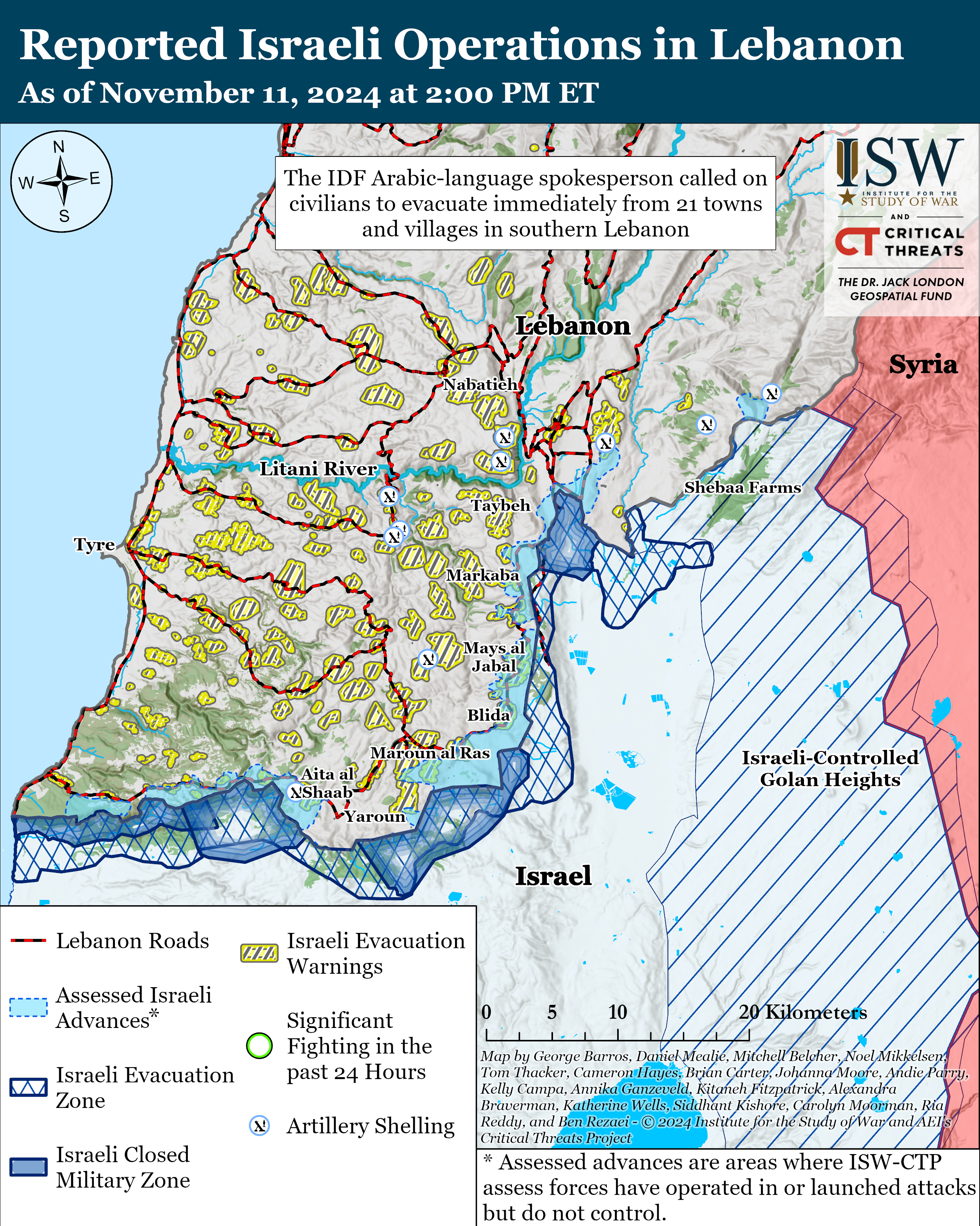 The IDF Arabic-language spokesperson called on civilians to evacuate immediately from 21 towns and villages in southern Lebanon on November 11.[63] The spokesperson told residents that they should head north of the Awali River.[64] Most of the towns from which the IDF asked Lebanese civilians to evacuate are located along the front or second lines of the Israel-Lebanon border. The spokesperson said that the IDF will act “forcefully” against Hezbollah activities in the areas of these specified towns.[65]
