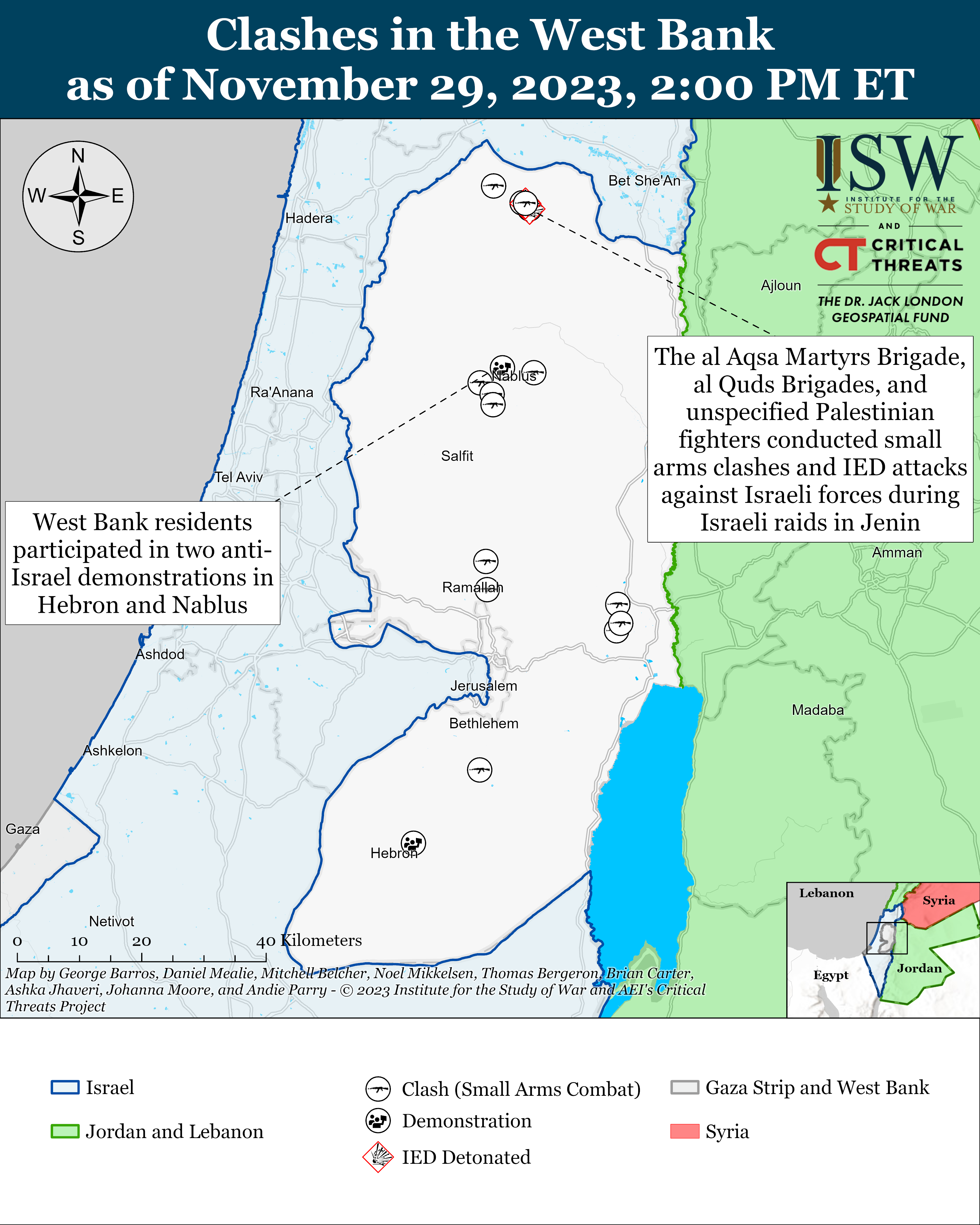Palestinian fighters conducted 22 attacks against Israeli forces in the West Bank on November 29.[41] This attack rate is more than double the average daily attack rate since November 21. The al Aqsa Martyrs Brigades, al Quds Brigades, and unspecified Palestinian fighters fired small arms at Israeli forces at least 18 times in the West Bank.[42] Palestinian fighters also detonated four IEDs targeting Israeli forces across the West Bank.[43] West Bank residents participated in two anti-Israel demonstrations in Hebron and Nablus.[44]