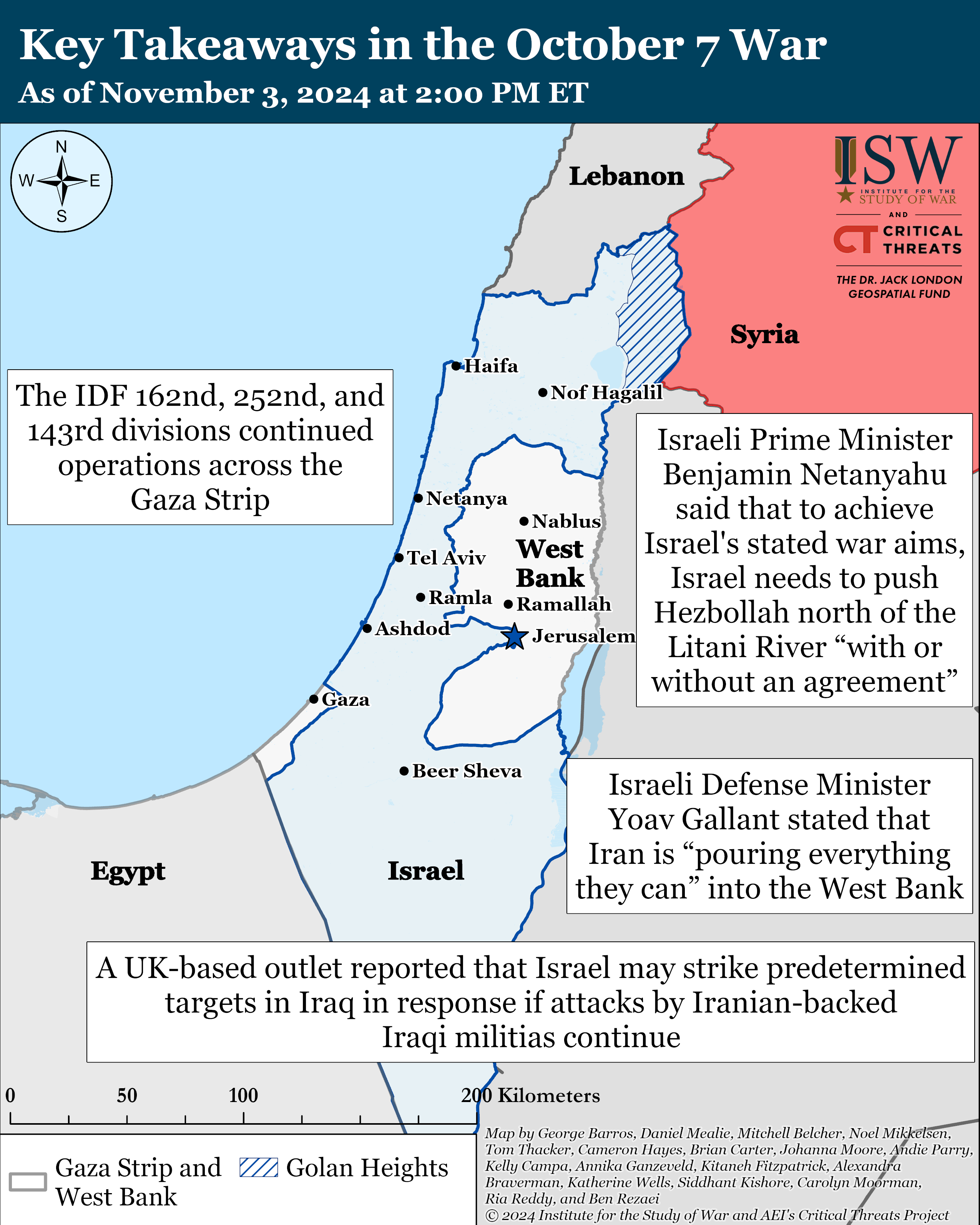- Israeli Ground Operations in Lebanon: The Israeli prime minister stated that Israel needs to push Hezbollah north of the Litani River “with or without an agreement” to achieve Israel’s stated war aims, which is to return residents of northern Israel to their homes under safe conditions. Current Israeli operations in southern Lebanon are unlikely to achieve these war aims, though it does not follow that future Israeli operations will fail to achieve the Israeli objectives