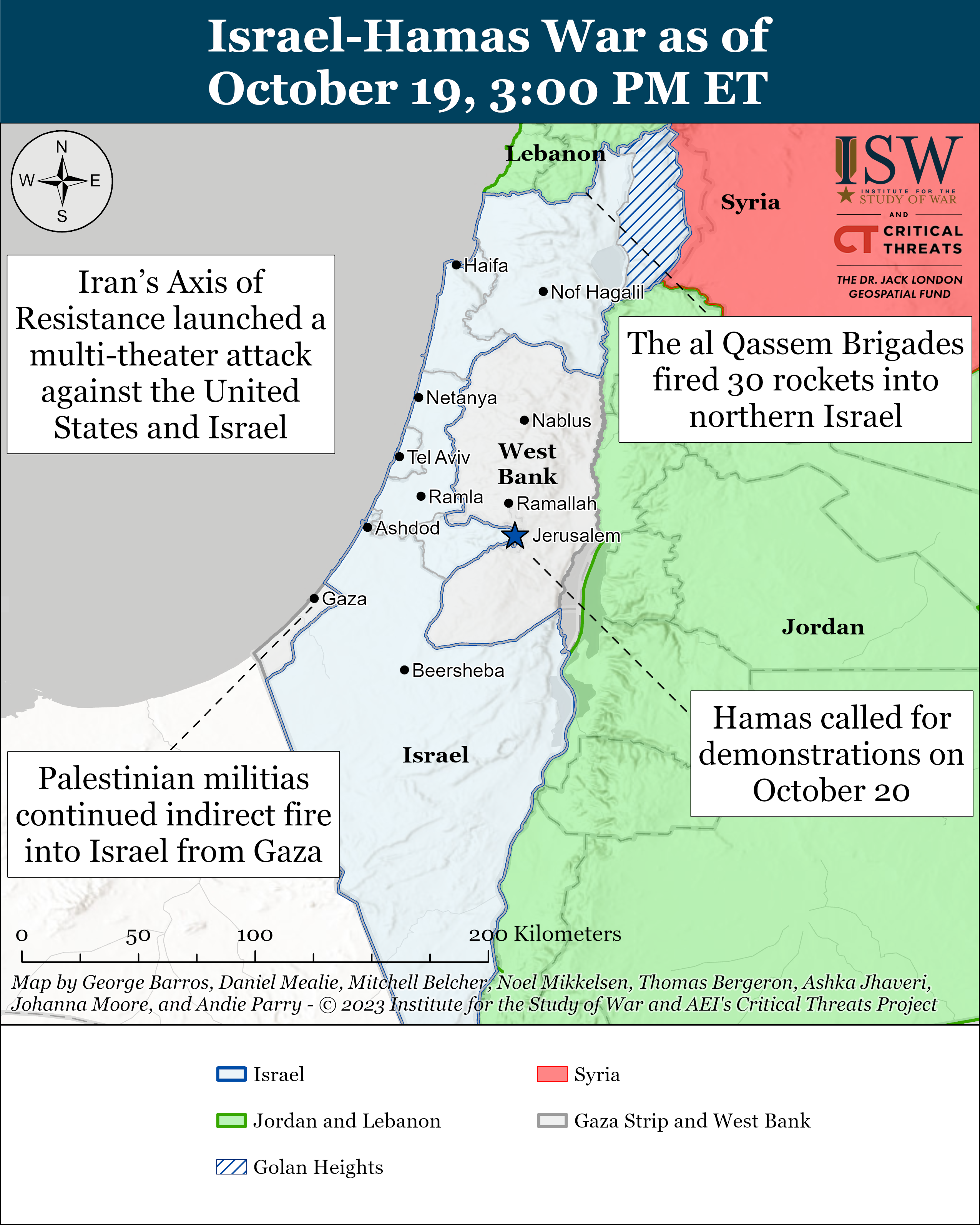 Note: CTP and ISW have refocused the update to cover the Israel-Hamas war. The new sections address developments in the Gaza Strip, the West Bank, Lebanon, and Syria, as well as noteworthy activity from Iran’s Axis of Resistance. We do not report in detail on war crimes because these activities are well-covered in Western media and do not directly affect the military operations we are assessing and forecasting. We utterly condemn violations of the laws of armed conflict, Geneva Conventions, and humanity even though we do not describe them in these reports.