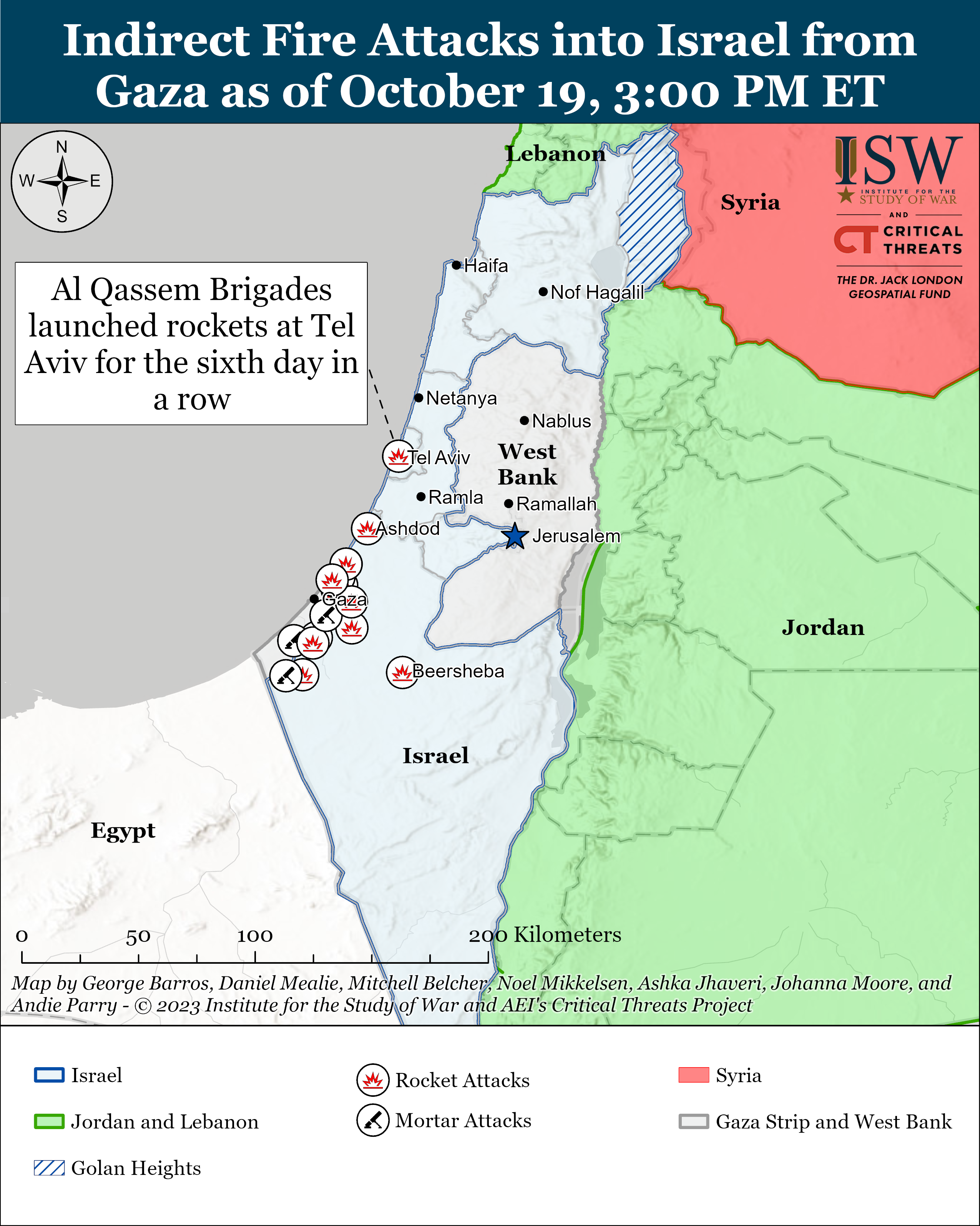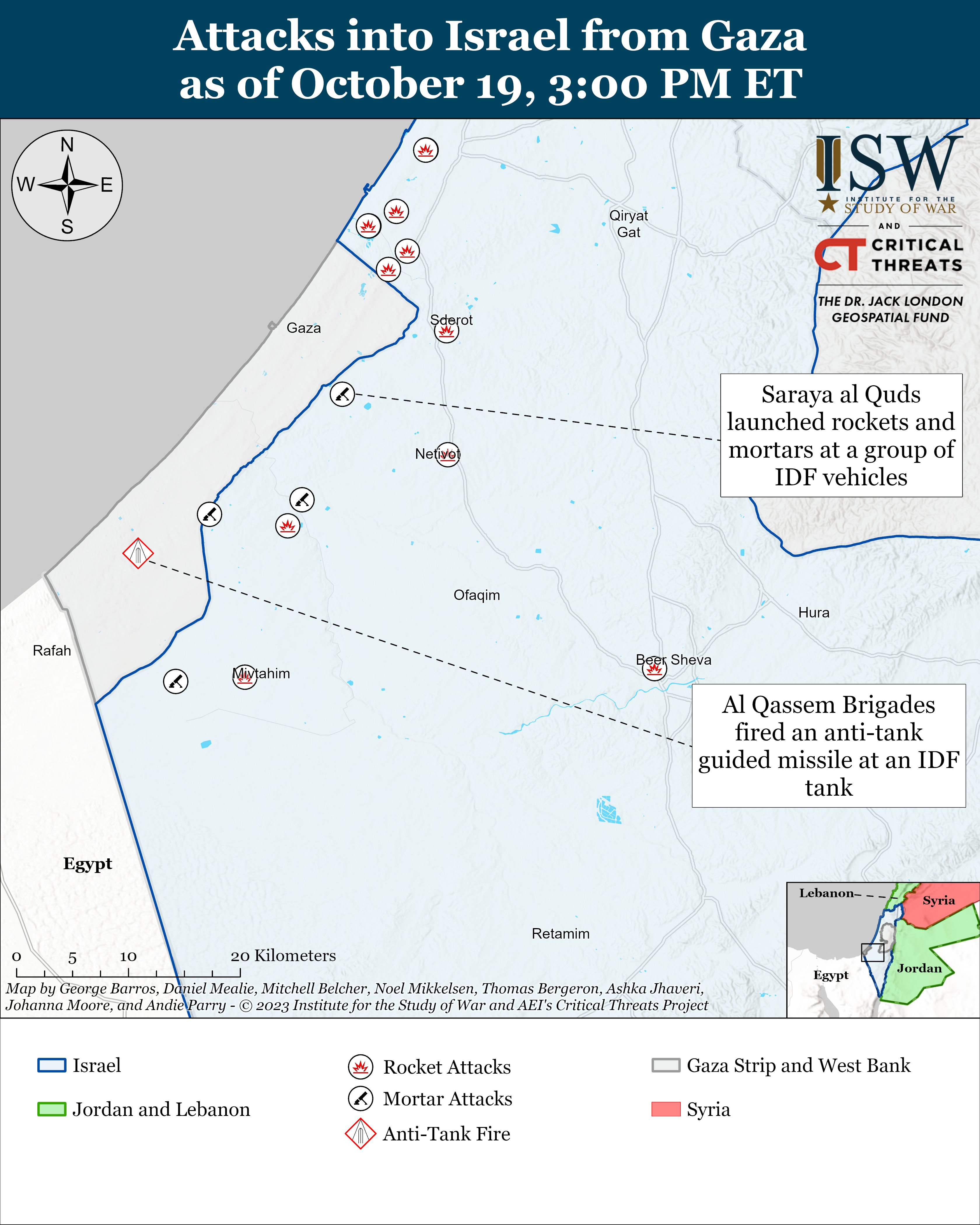 Palestinian militias targeted 12 Israel Defense Forces (IDF) military positions with indirect fire and anti-tank guided missiles (ATGM) in southern Israel on October 19. The militias hit 21 military positions on October 18. The IDF evacuated and designated the periphery of the Gaza Strip as a military zone on October 11.[6] CTP-ISW previously reported that the IDF deployed units to this area, suggesting that the militias seek to target IDF military targets in addition to civilian areas, such as Tel Aviv.