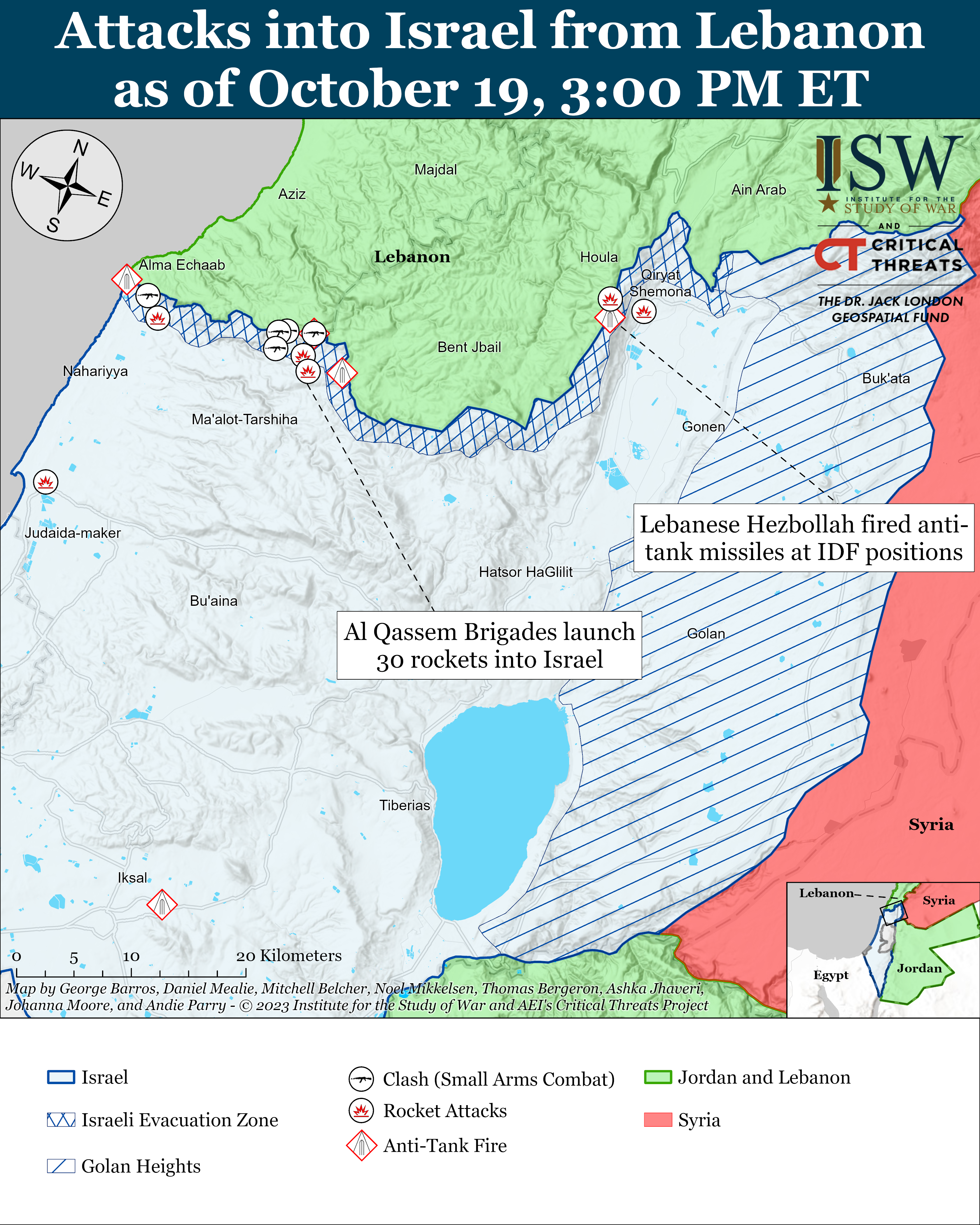 LH is allowing Palestinian militias to continue attacks from southern Lebanon into Israel. The al Qassem Brigades branch in Lebanon said on October 19 that its militants fired 30 rockets at western Israel.[25] CTP-ISW recorded rocket barrages fired toward both western and eastern Israel, however.[26] The IDF disclosed that LH gave the al Qassem Brigades permission to the fire rockets from Lebanon.[27] This reporting is consistent with CTP-ISW’s previous assessment that LH probably approves attacks from southern Lebanon into Israel given the extent to which LH controls southern Lebanon.[28]