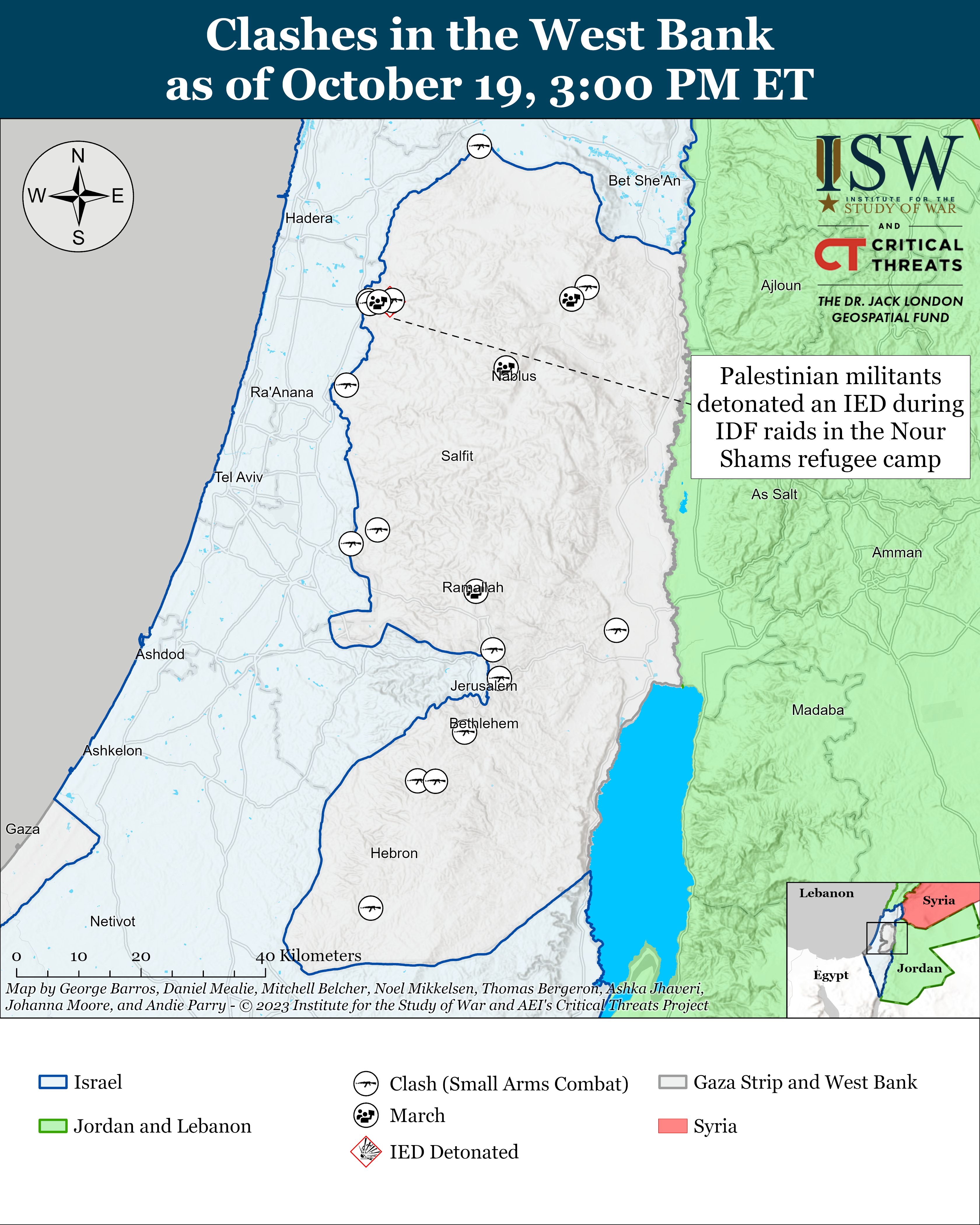 Clashes between Palestinian militants and Israeli forces in the West Bank may increase on October 19. CTP-ISW recorded 20 distinct clashes in the West Bank on October 19—half the number recorded the previous day.[13] Hamas called for protests in support of the Gaza Strip across all cities and towns in the West Bank on October 20, as part of Hamas’ effort to expand fighting against Israel to the West Bank.[14] Anti-Israel activity in the West Bank has typically surged on days when Hamas calls for demonstrations and greater violence since the war began.