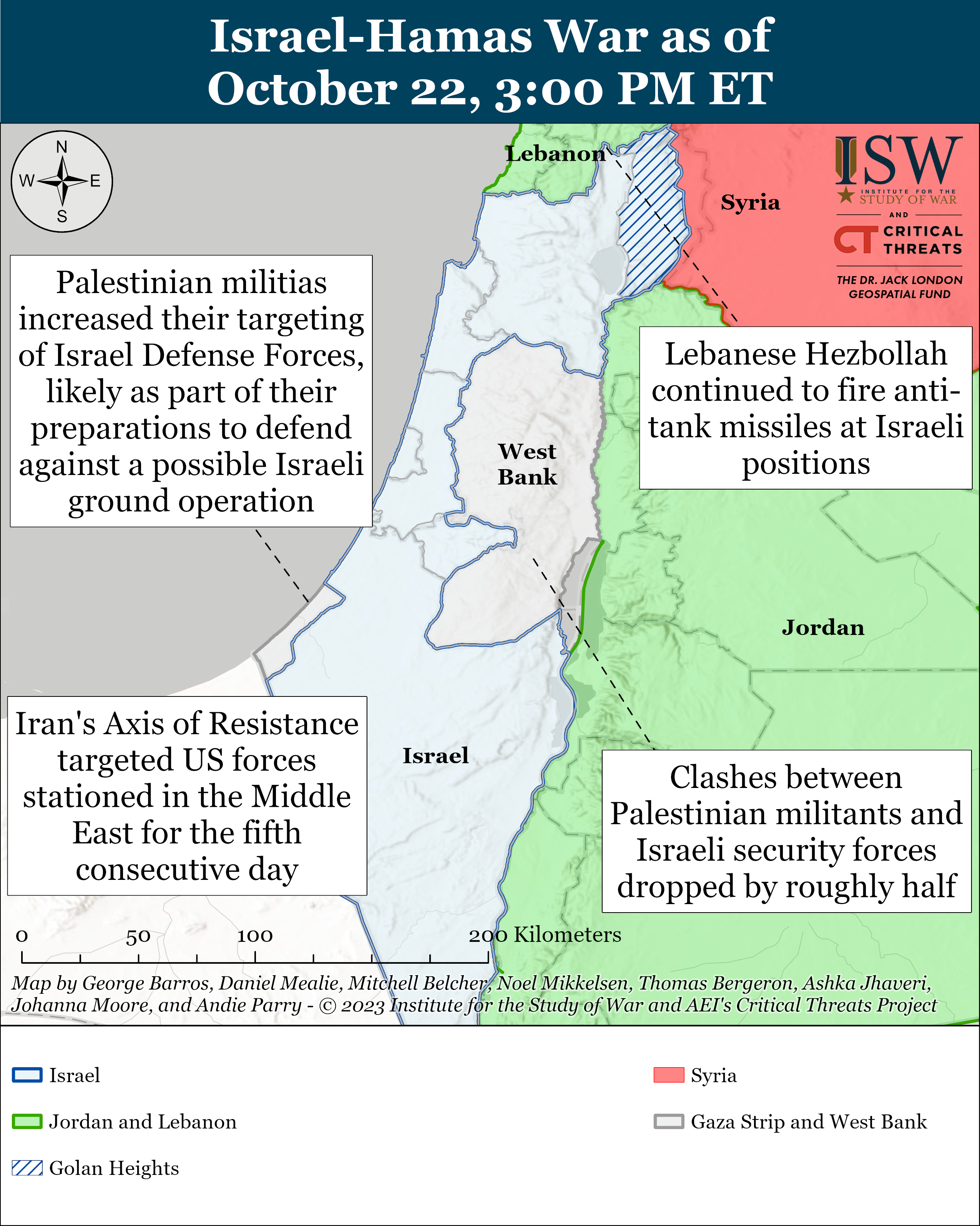 Note: CTP and ISW have refocused the update to cover the Israel-Hamas war. The new sections address developments in the Gaza Strip, the West Bank, Lebanon, and Syria, as well as noteworthy activity from Iran’s Axis of Resistance. We do not report in detail on war crimes because these activities are well-covered in Western media and do not directly affect the military operations we are assessing and forecasting. We utterly condemn violations of the laws of armed conflict, Geneva Conventions, and humanity even though we do not describe them in these reports.