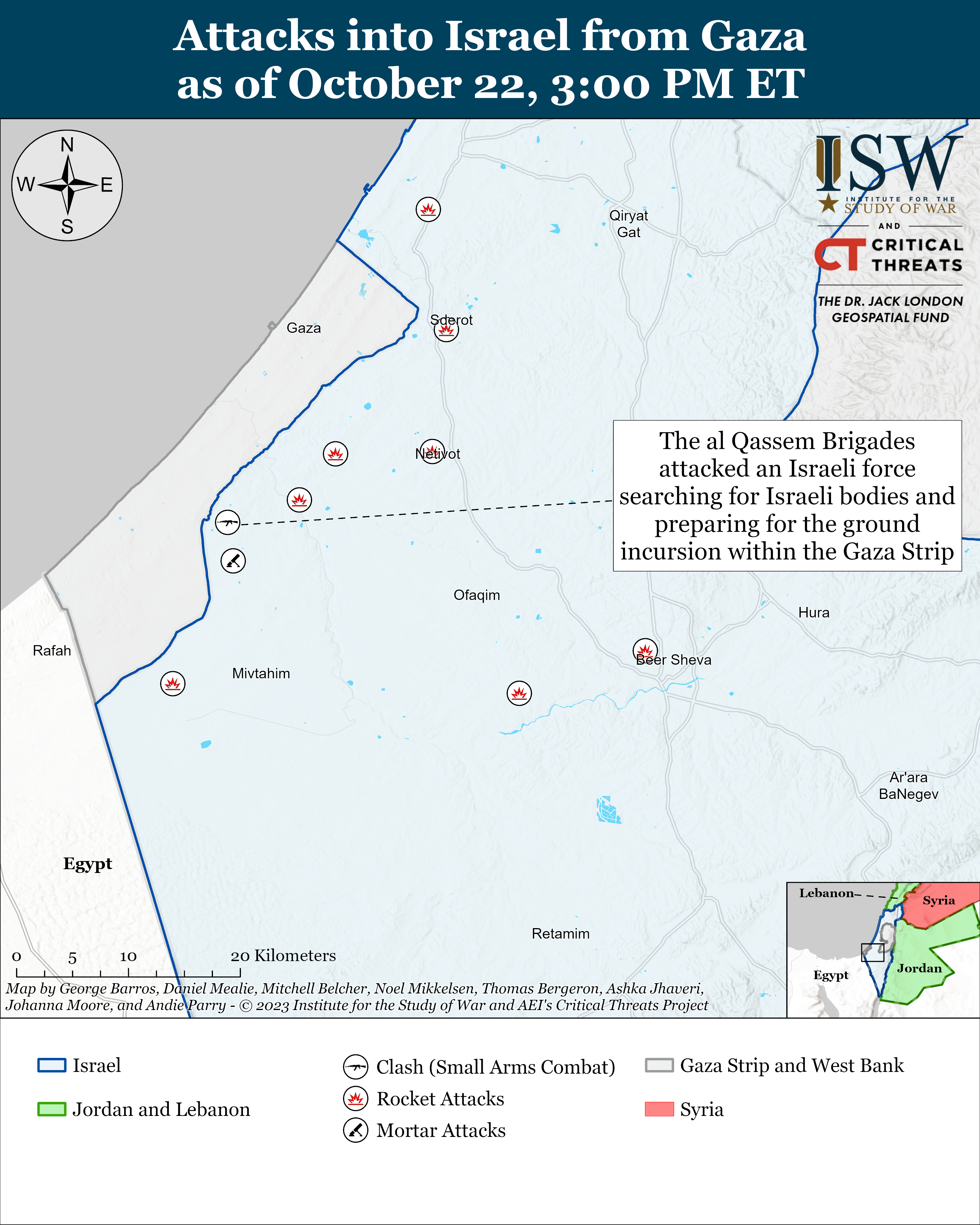 Palestinian militias in the Gaza Strip increased their targeting of the Israel Defense Forces (IDF), likely as part of their preparations to defend against a possible Israeli ground operation. Palestinian militias targeted a greater proportion of military targets relative to their overall attacks than at any point since October 18, when the militias targeted IDF positions near the Gaza Strip 15 times.[3] Palestinian militias launched eight direct and indirect fire attacks targeting the IDF on October 22.[4] They also fired mortars and rockets targeting Israeli cities and towns seven times. Al Qassem Brigades fighters separately killed one Israeli soldier and wounded three others during a firefight within the Gaza Strip.[5] The IDF said that the Israeli forces were searching for the bodies of missing Israelis and preparing for Israel’s ground operation.[6]