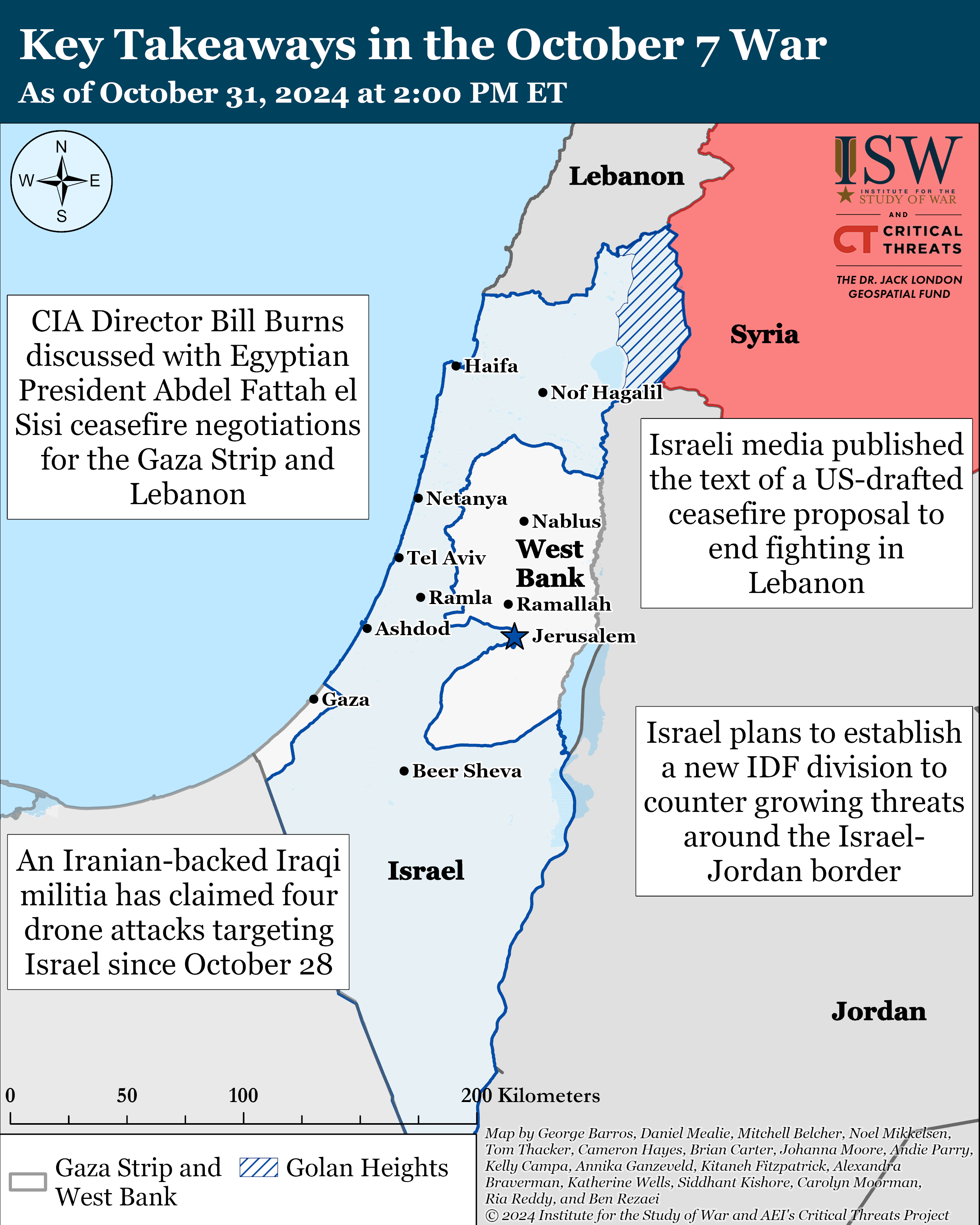 CIA Director Bill Burns discussed possible ceasefires for the Gaza Strip and Lebanon with Egyptian President Abdel Fattah el Sisi and Egyptian intelligence chief Hassan Rashad in Cairo on October 31.[31] Sisi publicly proposed an initial two-day ceasefire in which four Israeli hostages would be exchanged for an unspecified number of Palestinian prisoners.[32] The two-day ceasefire would be followed by 10 days of further negotiations. Israel and international mediators began sharing new ceasefire proposals after Israel killed Hamas leader Yahya Sinwar in the Gaza Strip on October 16. CTP-ISW continues to assess that Sinwar’s death is unlikely to prompt a shift in Hamas strategy in the war or in ceasefire-hostage negotiations.[33] Hamas leaders reiterated on October 31 their maximalist demands of a full Israeli withdrawal from the Gaza Strip and permanent ceasefire.[34]