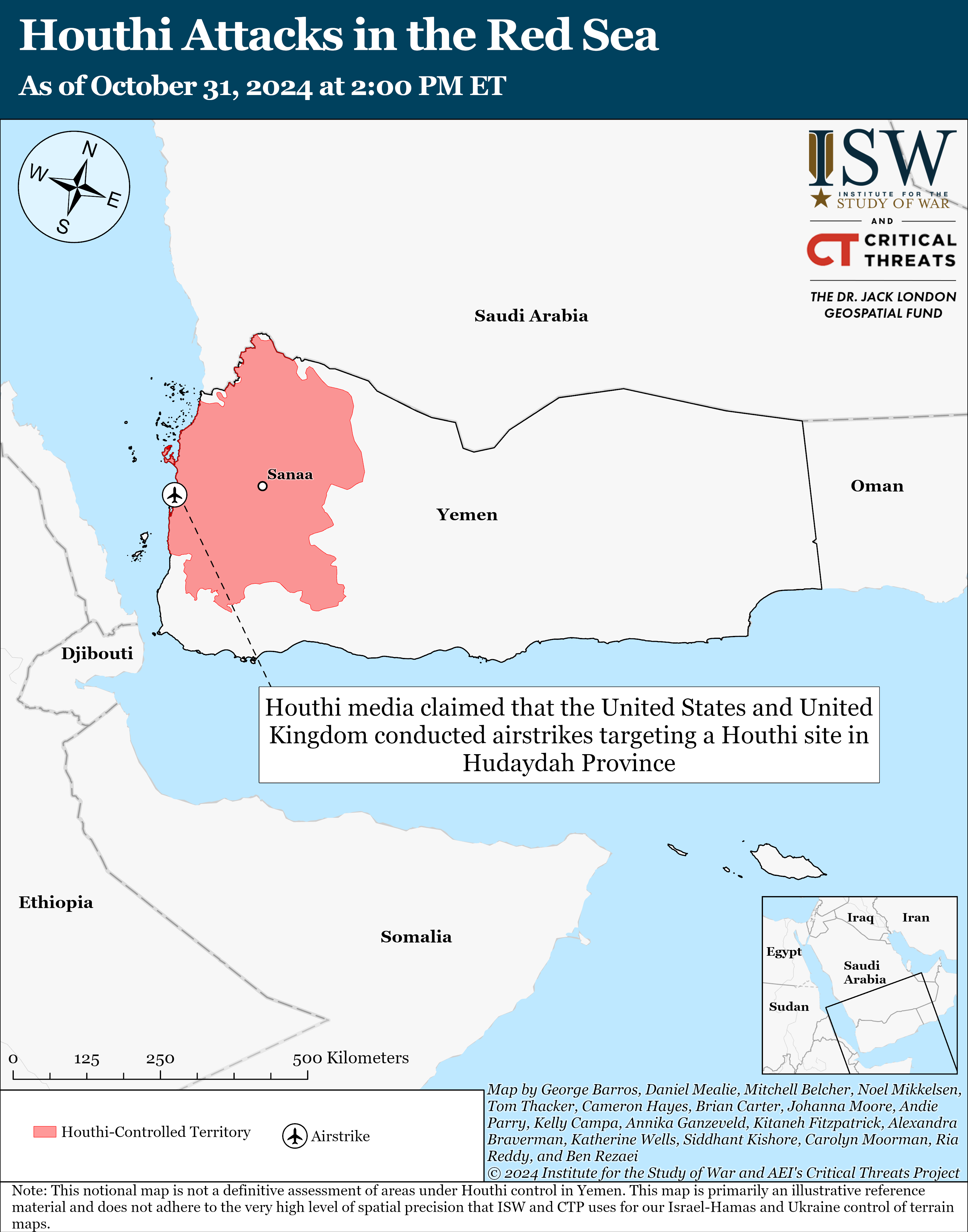 Houthi media claimed on October 31 that the United States and the United Kingdom conducted an airstrike targeting an unspecified site near al Hudaydah University in Hudaydah Province, Yemen.[94] US Central Command has not confirmed the strike at the time of this writing.