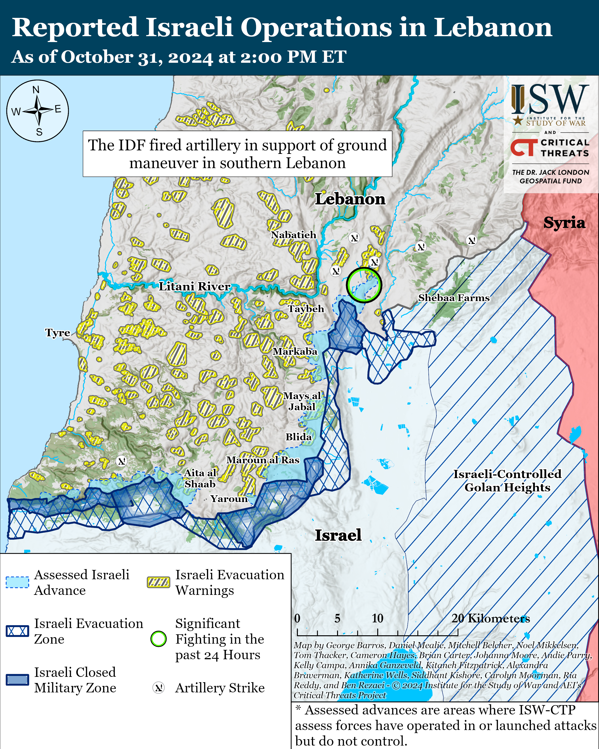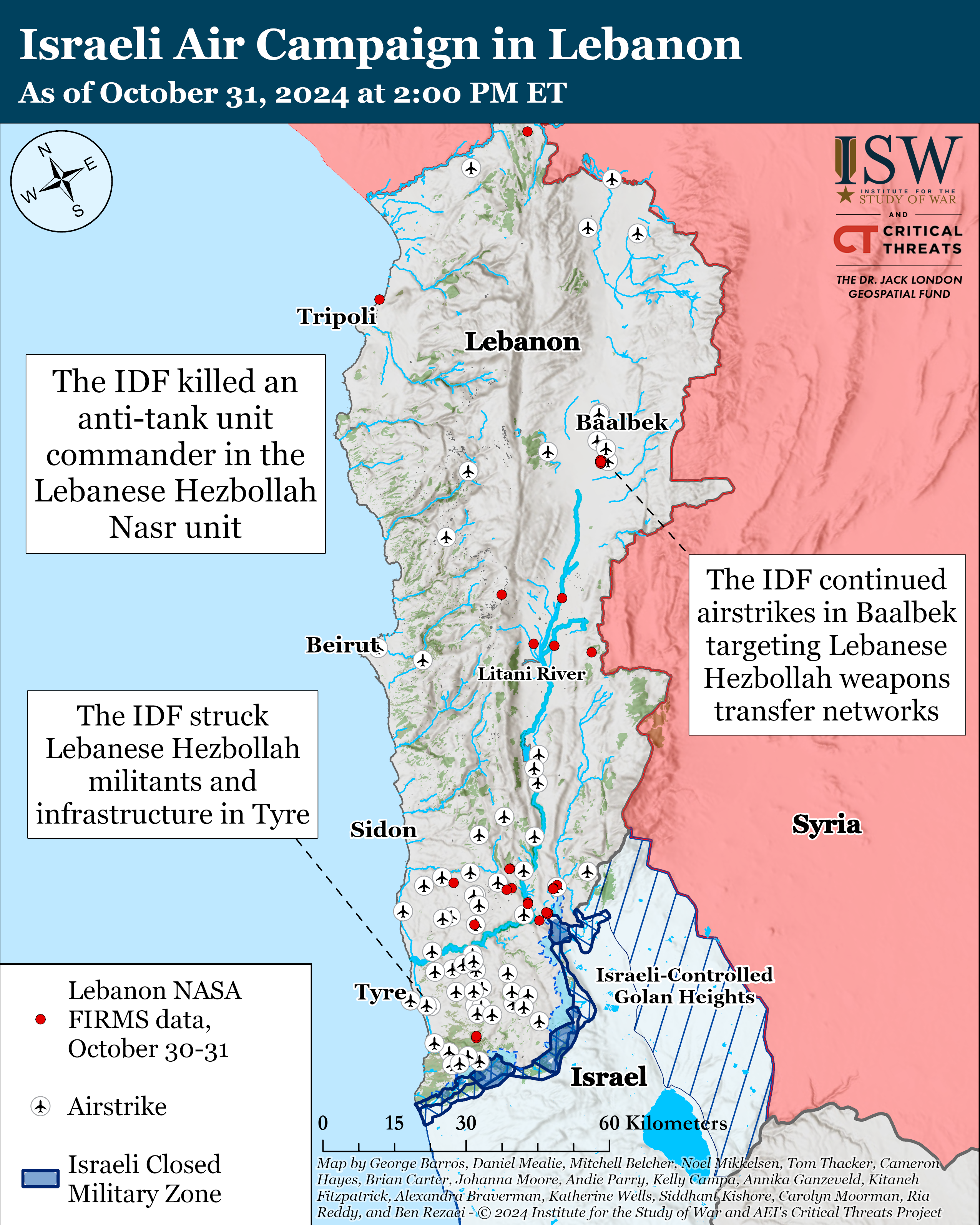 This map illustrates individual Israeli air and artillery strikes based on local Lebanese reporting. This map depicts strikes reported from 2:00pm ET on October 30 to 2:00pm ET on October 31. This map is not exhaustive. CTP-ISW cannot independently verify the locations of Israeli strikes.