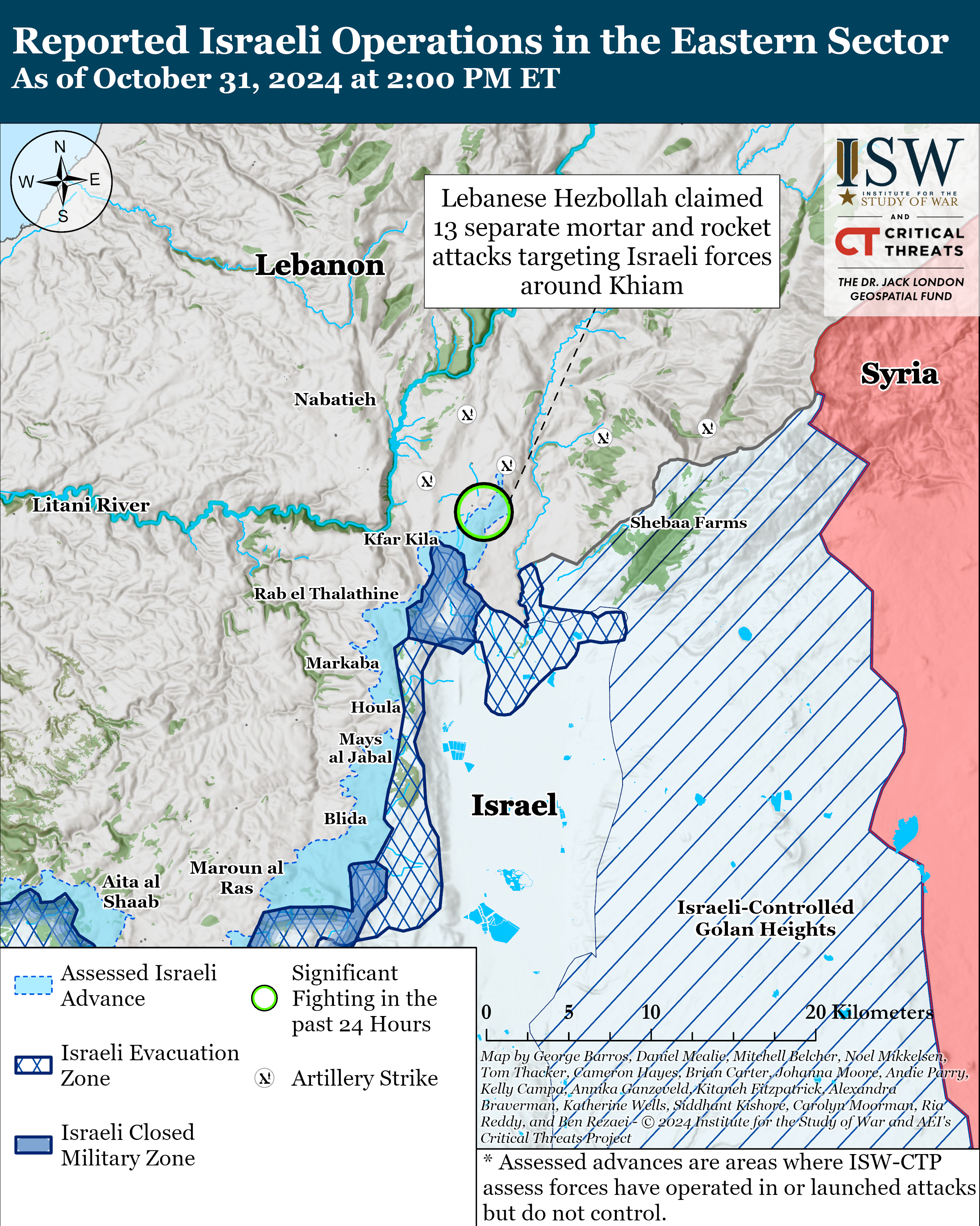 Hezbollah has continued to engage Israeli forces around Khiam, southeastern Lebanon, since CTP-ISW’s data cutoff on October 30. Hezbollah claimed 13 separate mortar and rocket attacks targeting Israeli forces around Khiam.[48] Lebanese media reported small arms combat between Israeli forces and Hezbollah militants around Khiam.[49]