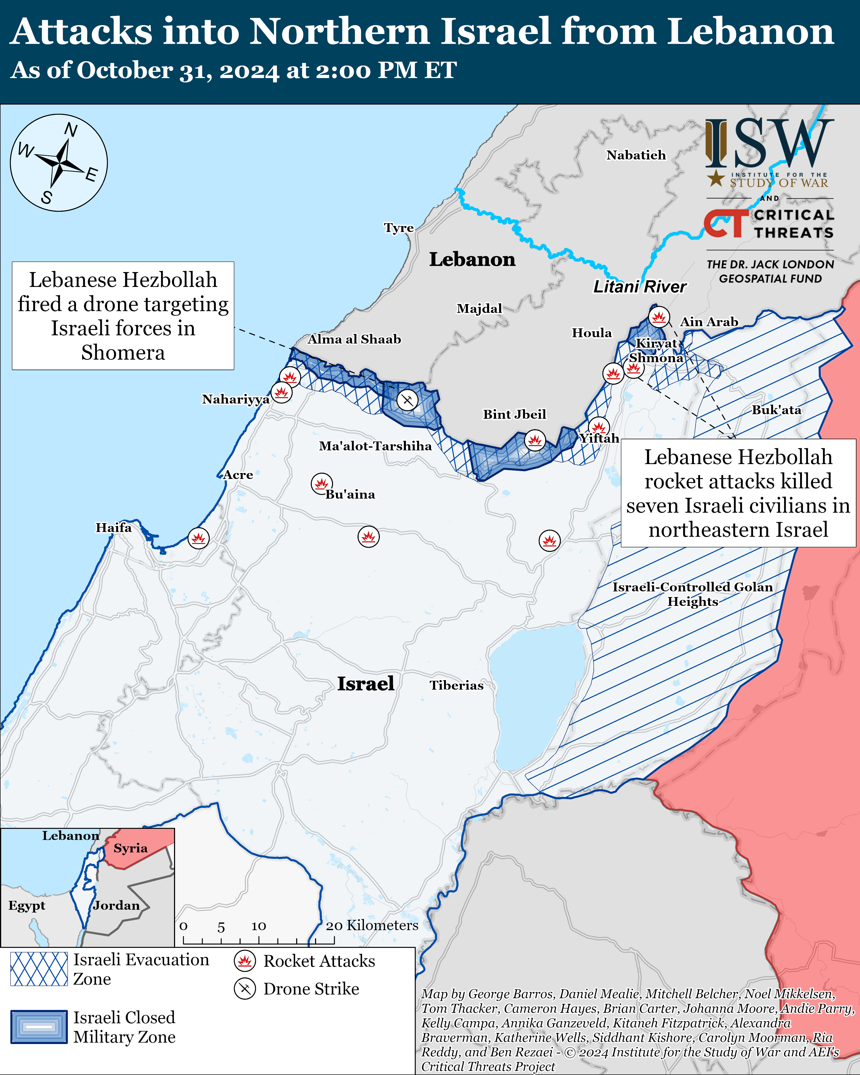 Hezbollah has conducted at least 12 attacks into Israel since CTP-ISW’s last data cutoff on October 30.[71] Hezbollah rocket attacks killed seven Israeli civilians in northeastern Israel on October 31.[72] This high casualty count is abnormal, though it is unclear whether the attacks mark a change in Hezbollah tactics. An Israeli Army Radio correspondent reported that Hezbollah rockets killed five farmworkers in Metula and two other civilians in Kiryat Shmona.[73] Hezbollah conducted two rocket attacks targeting Israel forces and civilians in Kiryat Shmona.[74] Hezbollah launched a one-way attack drone targeting Israeli forces in Shomera, which is adjacent to where some Israeli forces are in southern Lebanon.[75] Hezbollah also fired rockets targeting Israeli warehouses near Acre, northwestern Israel.[76]