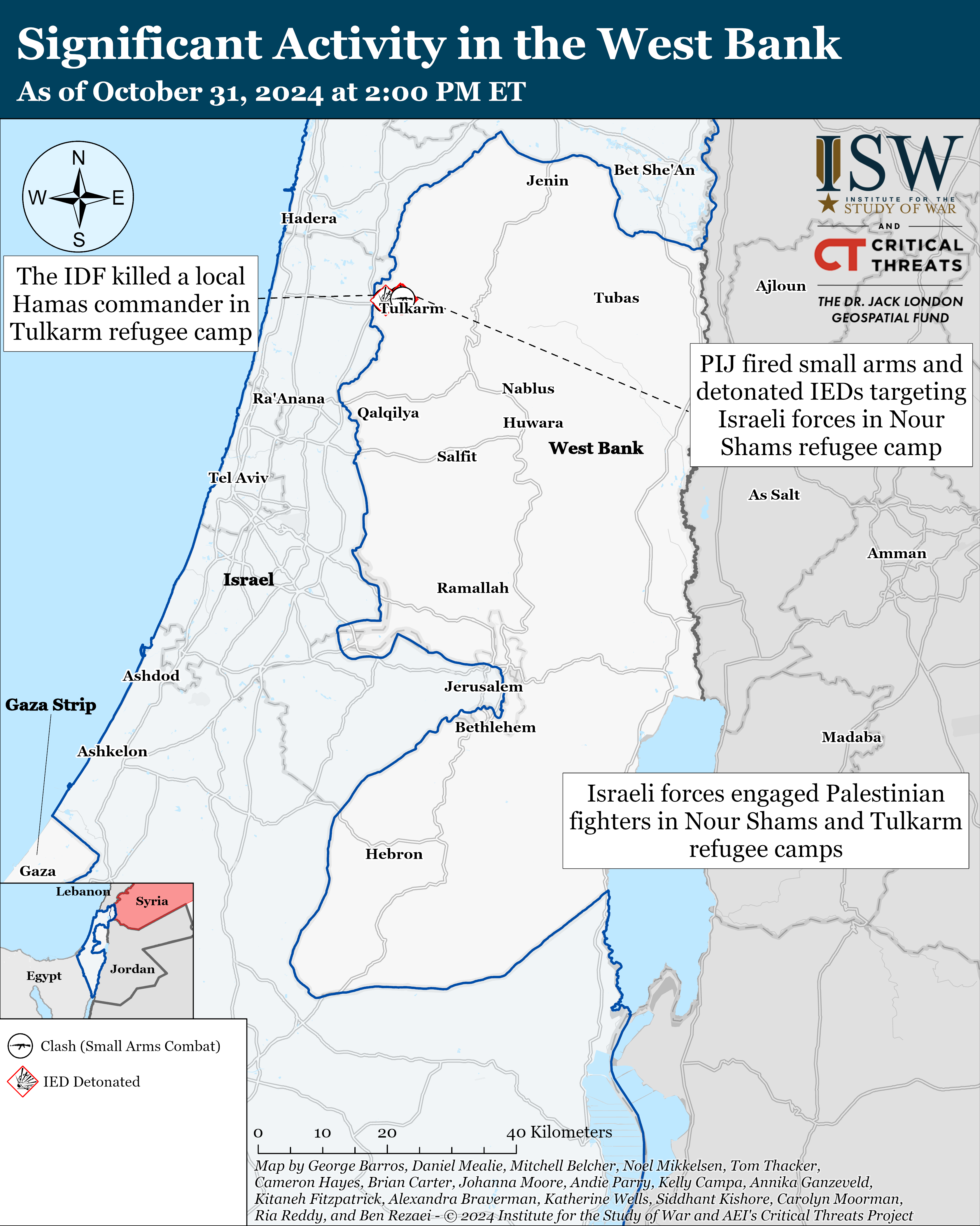Israeli forces conducted overnight raids on October 30 and 31 in Tulkarm and killed a local Hamas commander.[37] The IDF killed Hussam al Malah, who was planning near-term attacks against Israel.[38] Malah reportedly commanded a Hamas cell that had planned to conduct a “major terror attack” on the anniversary of the Hamas October 7 attack into Israel.[39] The IDF has killed two other members of the Malah-led cell in recent days.[40] The IDF separately conducted an airstrike targeting a Palestinian militia cell that fired small arms targeting Israeli forces in Nour Shams refugee camp in Tulkarm.[41]