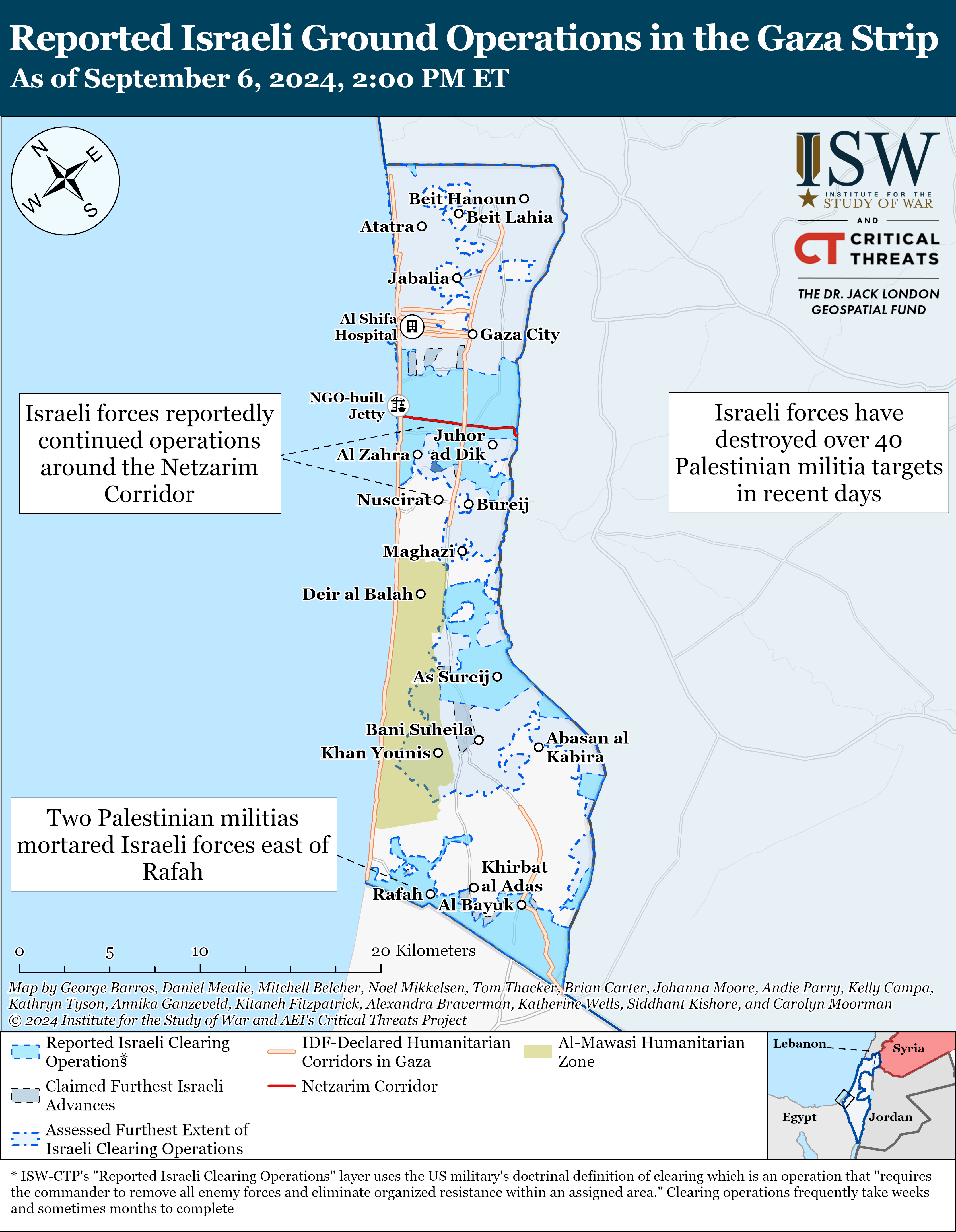 Palestinian sources reported that Israeli forces operated around the Netzarim Corridor on September 6. A Palestinian journalist reported small arms fire and shelling south of Gaza City.[46] Palestinian residents told Reuters that Israeli tanks have been operating in Zaytoun in southern Gaza City for over a week.[47] A Palestinian journalist also reported IDF small arms fire north and northwest of Nuseirat refugee camp.[48] Commercially available satellite imagery captured on September 6 showed flattened terrain along Wadi Gaza, north of Nuseirat, indicating that Israeli tanks or bulldozers operated in the area. The IDF has operated around the Netzarim Corridor in recent weeks in order to expand IDF control over territory along the corridor.[49]