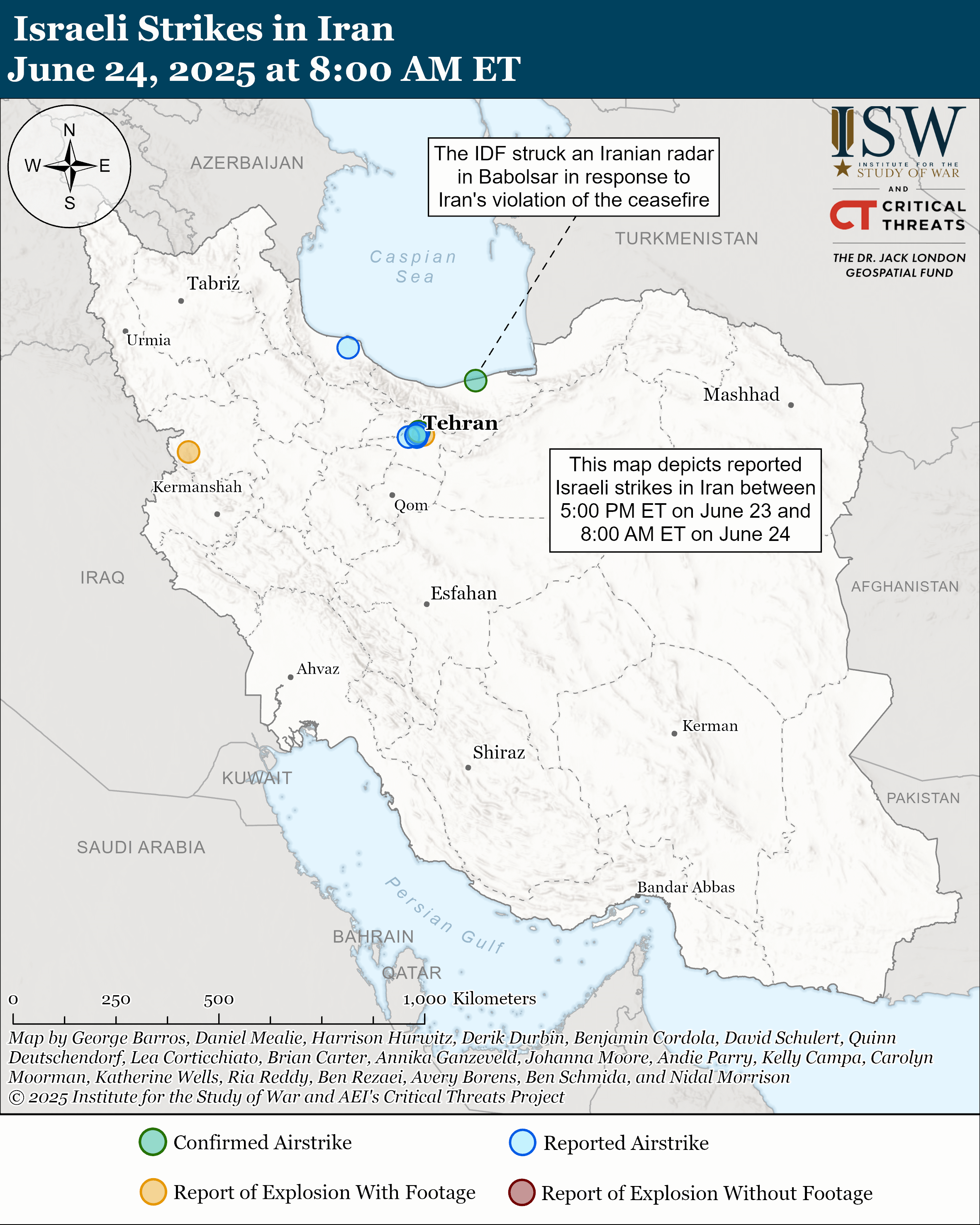 Israel has responded to perceived Iranian violations of the ceasefire but has not resumed its campaign at this time. Netanyahu said that Iran launched three ballistic missiles targeting Israel after the ceasefire went into effect.[7] Iranian media and officials denied the claim.[8] The Israel Defense Forces (IDF) struck a radar in Babolsar, north of Tehran, in response to the Iranian missile attack after 12:00 AM ET.[9] Netanyahu said that Israel would refrain from additional retaliatory attacks after a conversation with Trump.[10] Netanyahu told the Israeli cabinet and senior security officials that the IDF achieved all of its objectives in its campaign against Iran.[11] Iran has not conducted an attack on Israel since approximately 3:25 AM ET on June 24.[12] Israel has not conducted an attack on Iran since approximately 7:35 AM ET on June 24.[13]