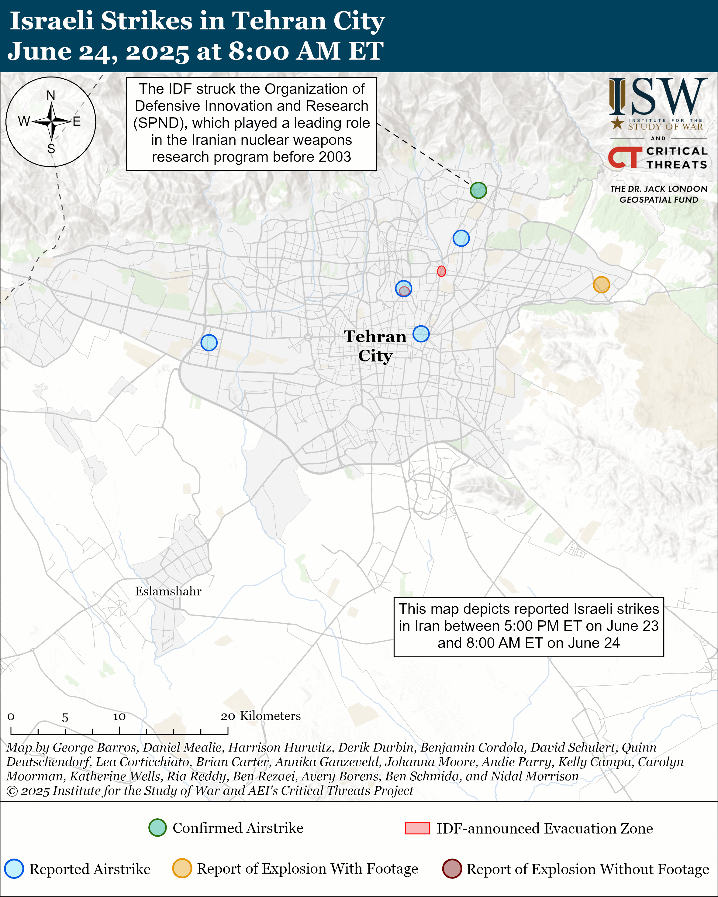 Israel conducted several waves of airstrikes in Tehran on June 23 and 24 before and after the ceasefire went into effect. An IDF spokesperson said that the Israeli Air Force dropped over 100 munitions on “dozens” of Iranian military targets in Tehran overnight on June 23 and 24.[19] A security source told Israeli Army Radio that the IDF struck Islamic Revolutionary Guards Corps (IRGC) assets, weapons production sites, nuclear laboratories, and personnel.[20] The IDF struck the Organization of Defensive Innovation and Research (SPND), which played a leading role in the Iranian nuclear weapons research program before 2003.[21] This attack marks the third time that the IDF has struck the SPND headquarters in Tehran.[22] The IDF also killed Iranian nuclear scientist Sayyed Mohammad Reza Seddighi Saber in Gilan Province. Saber led the SPND’s Shahid Karimi Group, which works on “explosives-related projects.”[23] The United States sanctioned Saber in May 2025 for conducting research and tests that could support the development of nuclear weapons.[24]