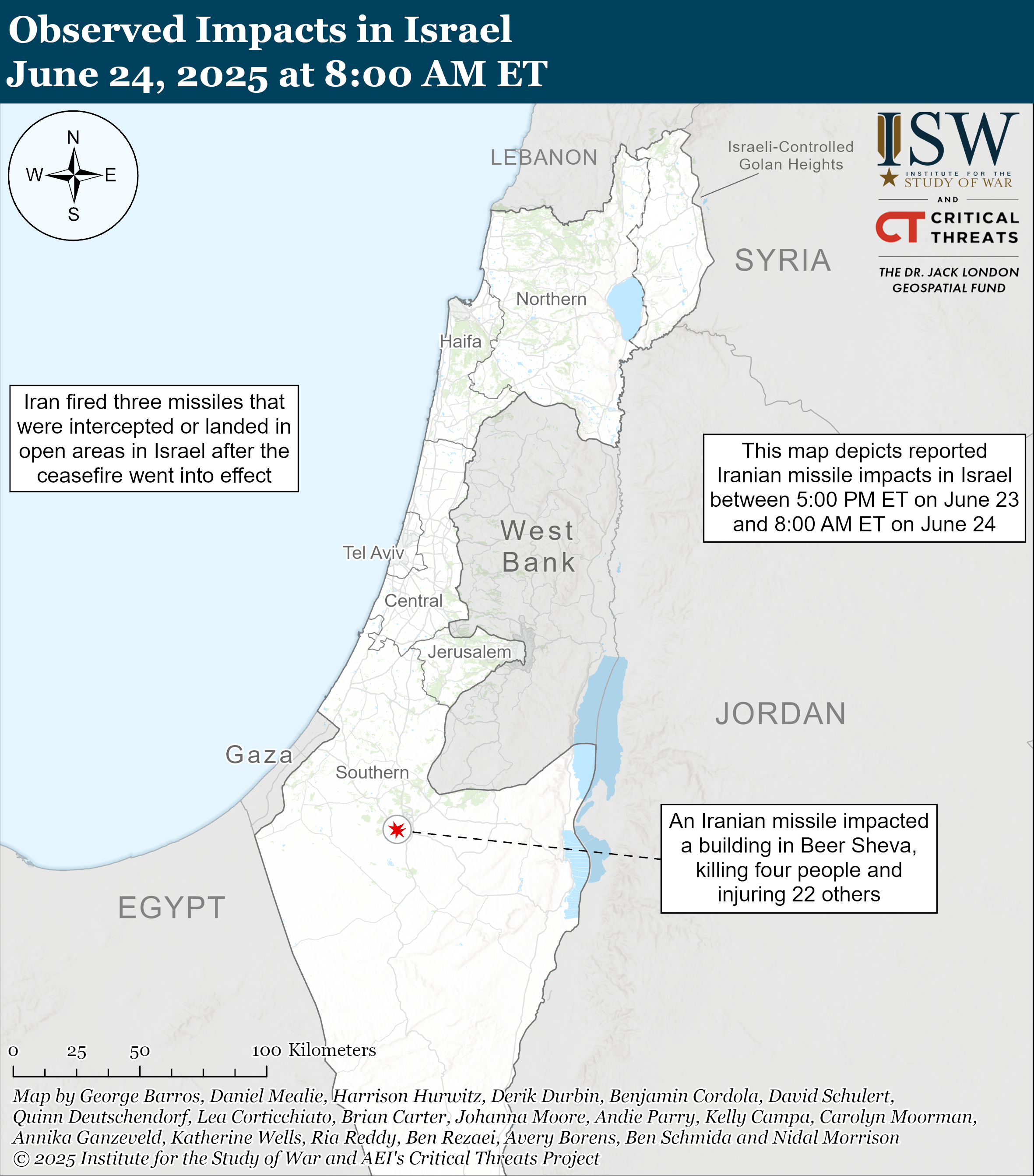 Iran has conducted at least seven ballistic missile attacks targeting Israel since CTP-ISW’s last data cutoff at 5:00 PM ET on June 23.[14] Iran launched five of the attacks before the ceasefire went into effect at 12:00 AM ET, one attack at 12:06 AM ET, and one attack around 3:25 AM ET.[15] An Iranian missile impacted a residential building in Beer Sheva in southern Israel, killing four people and injuring 22 others.[16] Iran fired three missiles after the ceasefire went into effect. The missiles were intercepted or landed in open areas in Israel.[17]