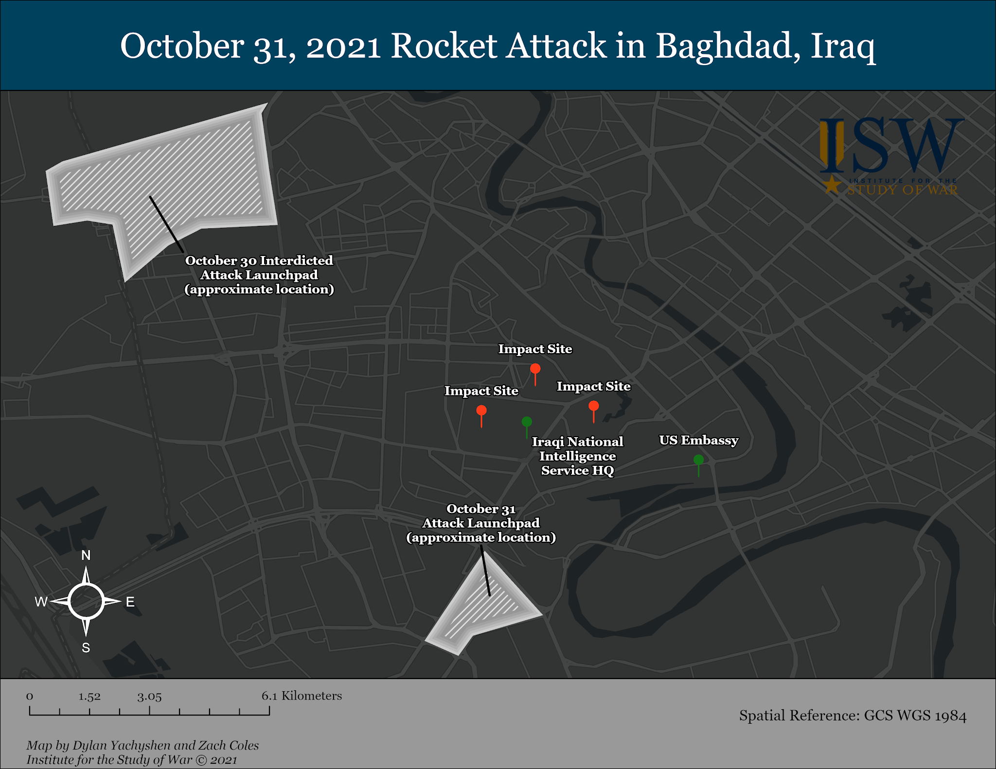 3. Iranian proxy militants fired three rockets likely targeting the Iraqi National Intelligence Service (INIS) headquarters in Baghdad on October 31 to threaten the Iraqi prime minister. All three rockets landed within one kilometer of the INIS headquarters at approximately 04:30 local time and caused no casualties. The timing, targeting, and relative inaccuracy of the attack indicates that proxy militants intended the attack to be harassing, not lethal.[23] Iraqi Prime Minister Mustafa al-Kadhimi reportedly visited the INIS, which he led prior to his premiership, on October 30.[24] Iraqi Security Forces (ISF) had located and dismantled another Katyusha rocket launchpad in Baghdad’s al-Shu’ala neighborhood on October 30 that may have also targeted the INIS.[25] Domestically, the attackers likely intended to signal to Kadhimi that he, his intelligence service, and his US backers are not welcome in Iraq’s next government. Proxy channels falsely claimed that the October 31 attack was targeting the US Embassy, which was outside the range of the rockets’ reported launch site.[26] Proxy media likely intended that claim to threaten the United States and possibly to signal a resumption of attacks in Iraq generally. Proxy militants later fired two explosives-laden drones at Kadhimi’s house in an attempted assassination on November 7.
