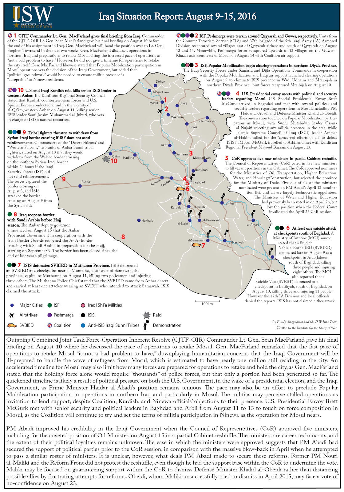 Outgoing Combined Joint Task Force-Operation Inherent Resolve (CJTF-OIR) Commander Lt. Gen. Sean MacFarland gave his final briefing on August 10 where he discussed the pace of operations to retake Mosul. Gen.MacFarland remarked that the fast pace of operations to retake Mosul “is not a bad problem to have,” downplaying humanitarian concerns that the Iraqi Government will be ill-prepared to handle the wave of refugees from Mosul,which is estimated to have nearly one million still residing in the city. An accelerated timeline for Mosul may also limit how many forces are prepared for operations to retake and hold the city, as Gen. MacFarland stated that the holding force alone would require “thousands” of police forces, but that only a portion had been generated so far. The quickened timeline is likely a result of political pressure on both the U.S. Government, in the wake of a presidential election,and the Iraqi Government, as Prime Minister Haidar al-Abadi’s position remains tenuous. The pace may also be an effort to preclude Popular Mobilization participation in operations in northern Iraq and particularly in Mosul. The militias may perceive stalled operations as invitation to lend support, despite Coalition, Kurdish, and Ninewa officials’ objections to their presence. U.S.Presidential Envoy Brett McGurk met with senior security and political leaders in Baghdad and Arbil from August 11 to 13 to touch on force composition in Mosul, as the Coalition will continue to try and set the terms of militia participation in Ninewa as the operation for Mosul nears.